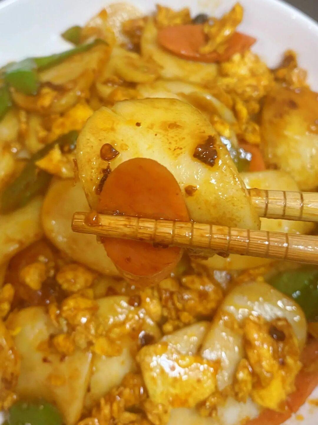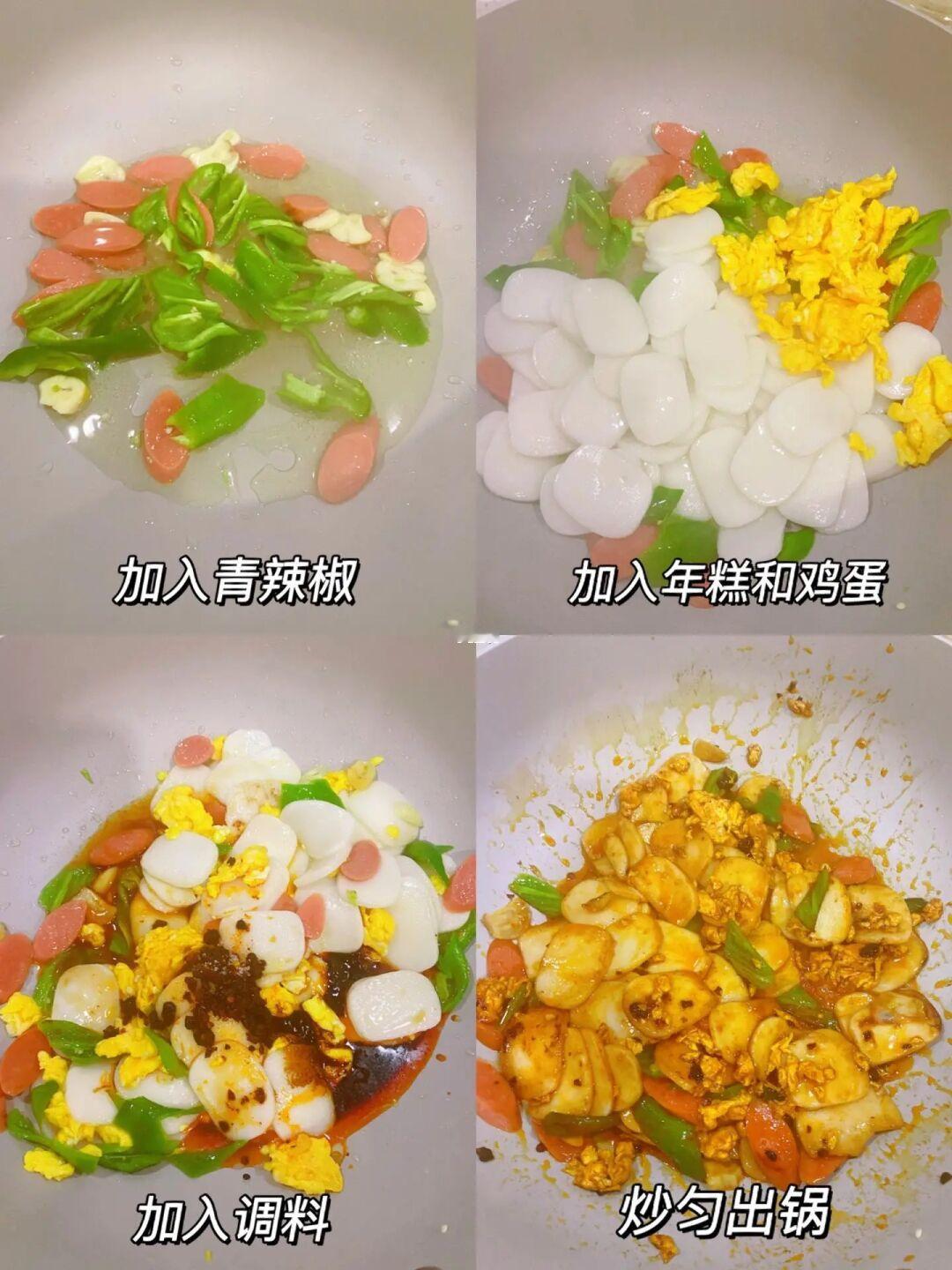 1⃣️年糕煮软捞出过一下凉水,鸡蛋炒散备用 2⃣️热油炒蒜片,加入火腿肠煎一下,再加入青辣椒炒软,加入年糕和鸡蛋 3⃣️加入1勺老干妈、2勺生抽、1勺老抽、1勺蚝油、1勺糖,炒匀出锅 完成✅ 不输外面的炒年糕 真的好吃!!!