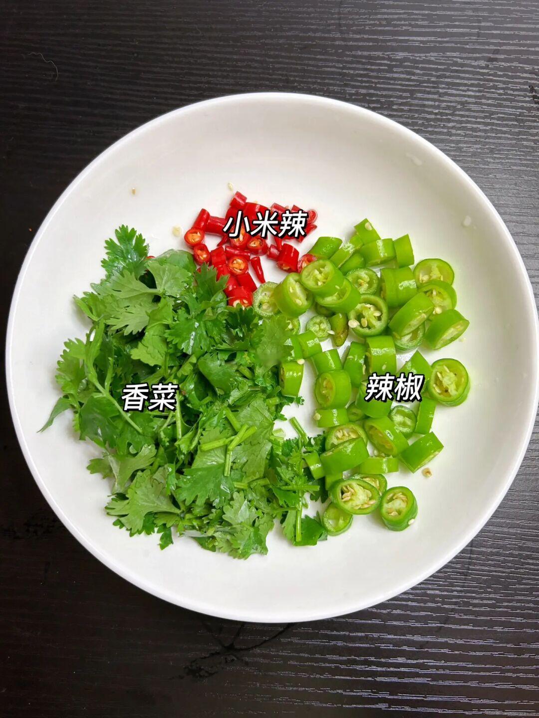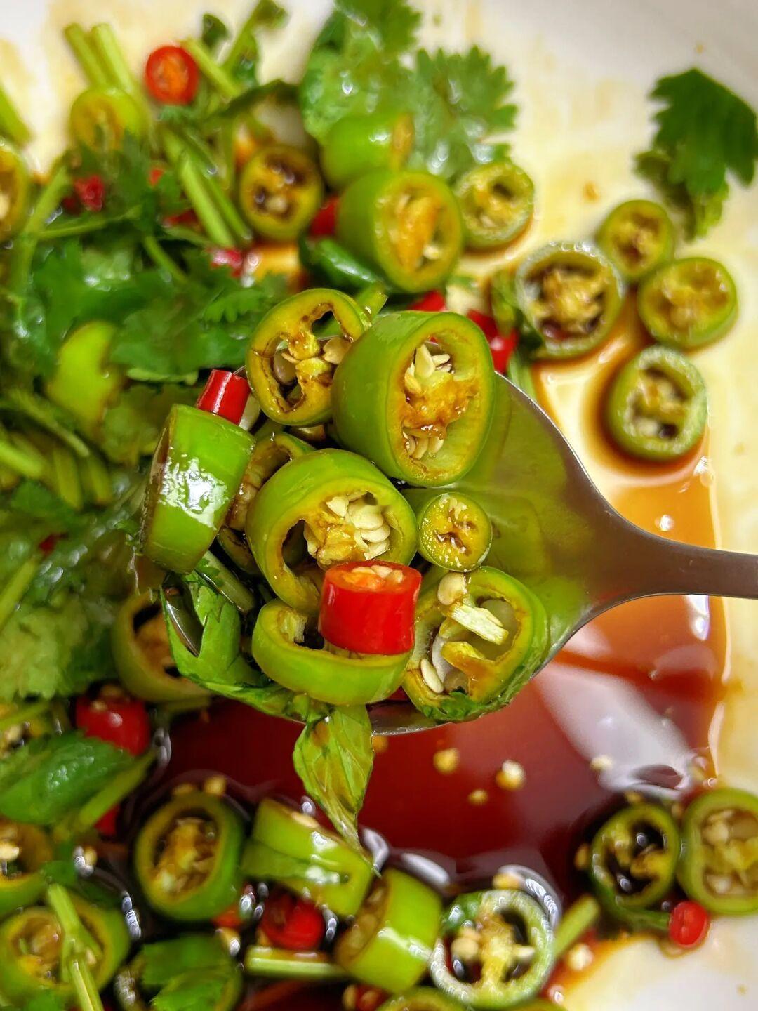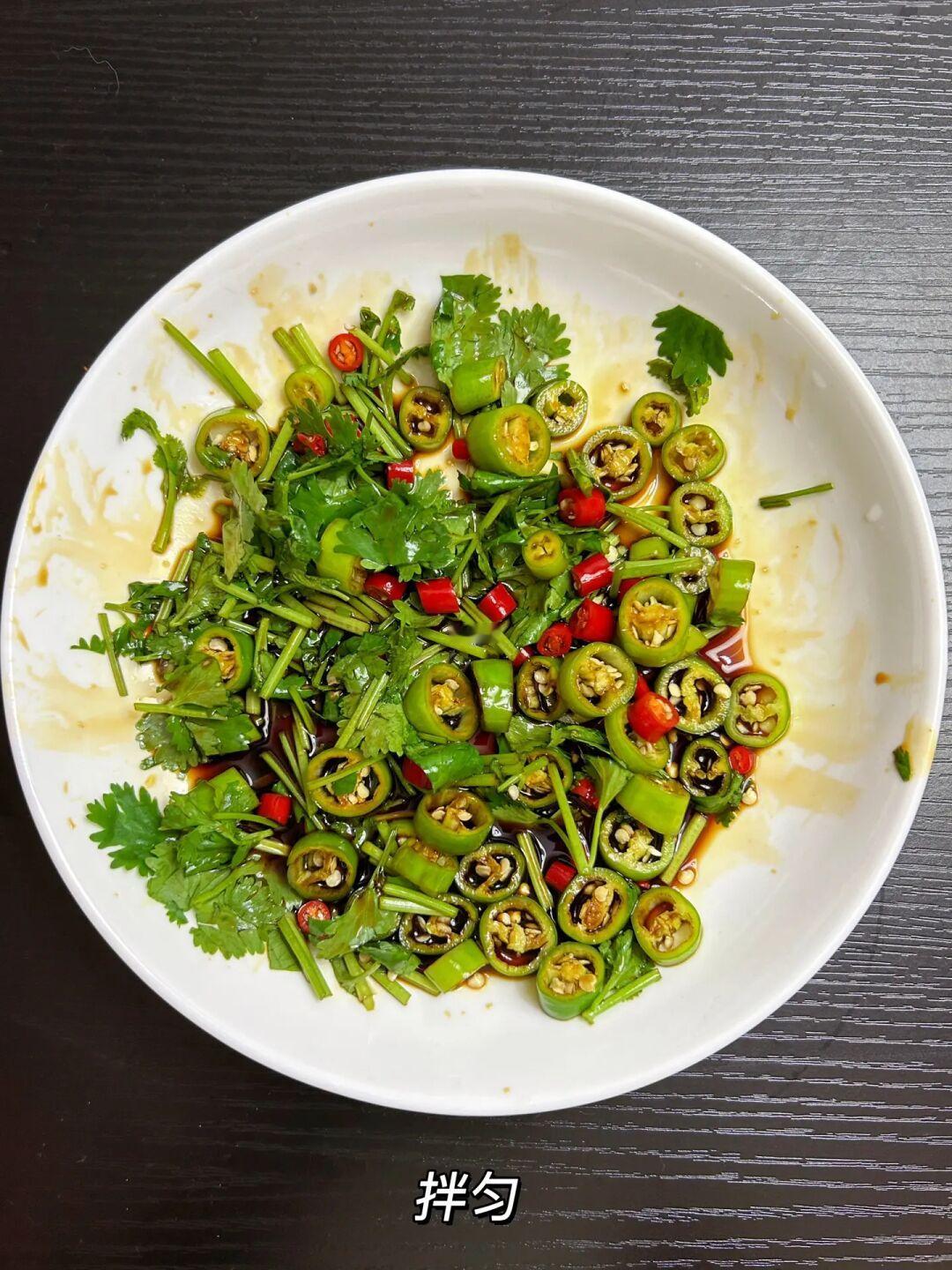 辣椒这么做特别好吃 超级下饭 配面条也很绝! 1⃣️香菜、辣椒、小米辣切碎装盘 2⃣️加入2勺生抽、1勺蚝油、1勺醋、1勺糖、1勺香油拌匀 完成✅ 可以放冰箱多腌几个小时 更加入味好吃!!