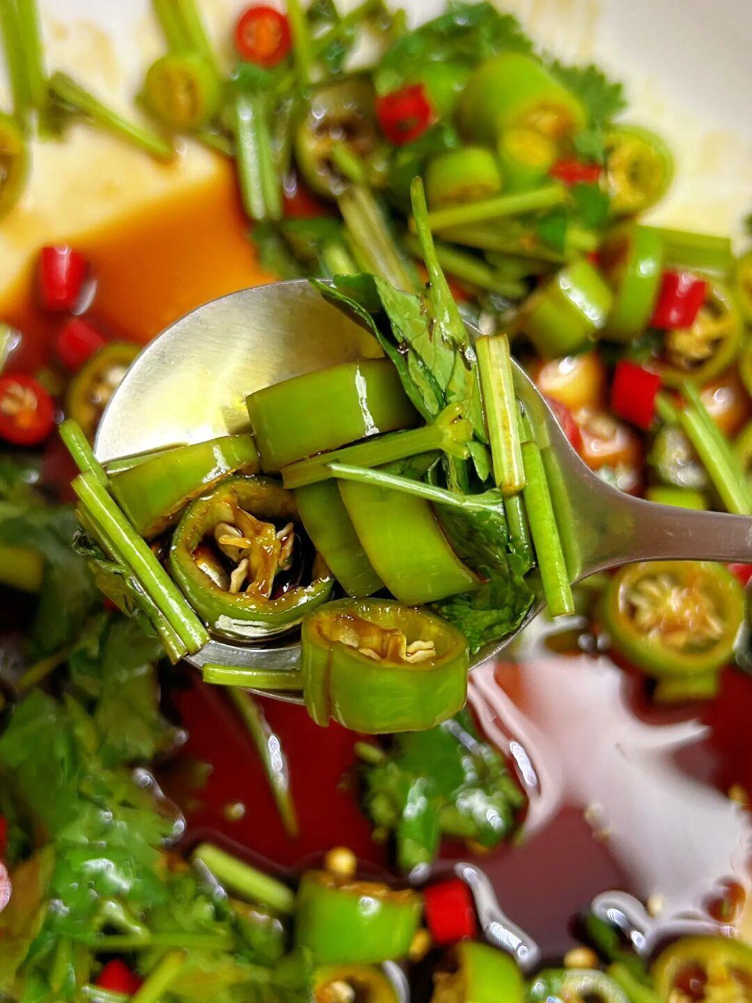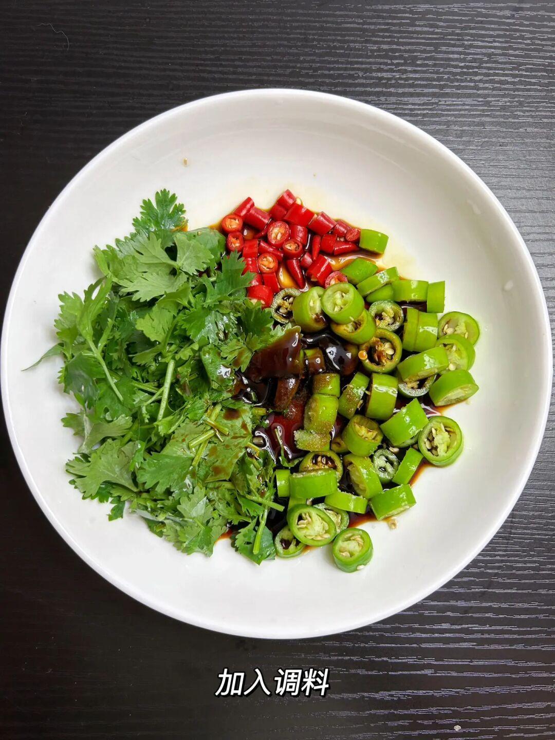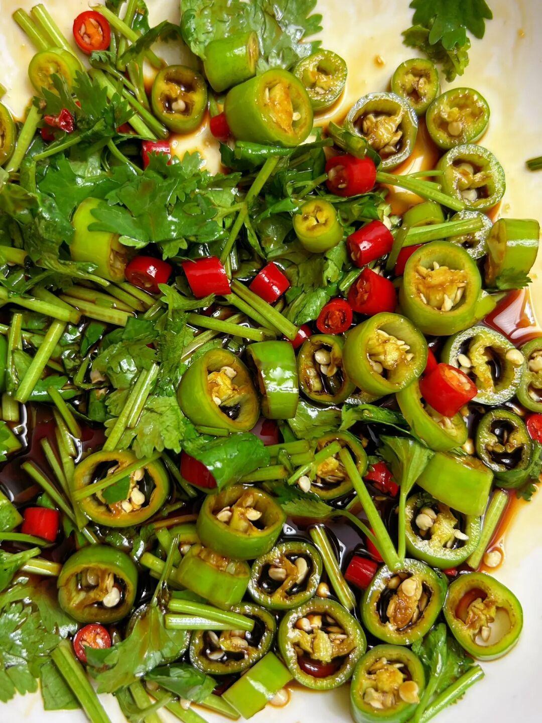辣椒这么做特别好吃 超级下饭 配面条也很绝! 1⃣️香菜、辣椒、小米辣切碎装盘 2⃣️加入2勺生抽、1勺蚝油、1勺醋、1勺糖、1勺香油拌匀 完成✅ 可以放冰箱多腌几个小时 更加入味好吃!!