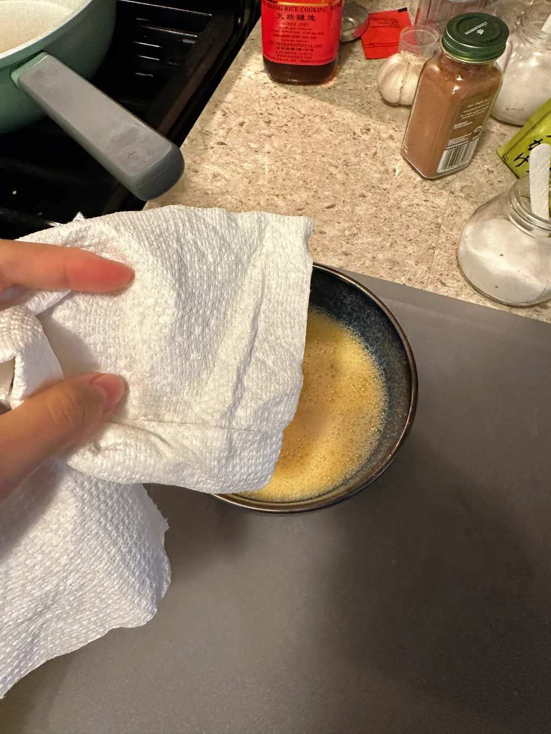 两颗鸡蛋敲开,加入150ml水,盐和高汤粉打散,用厨房纸吸去浮沫,或者用勺子舀掉;