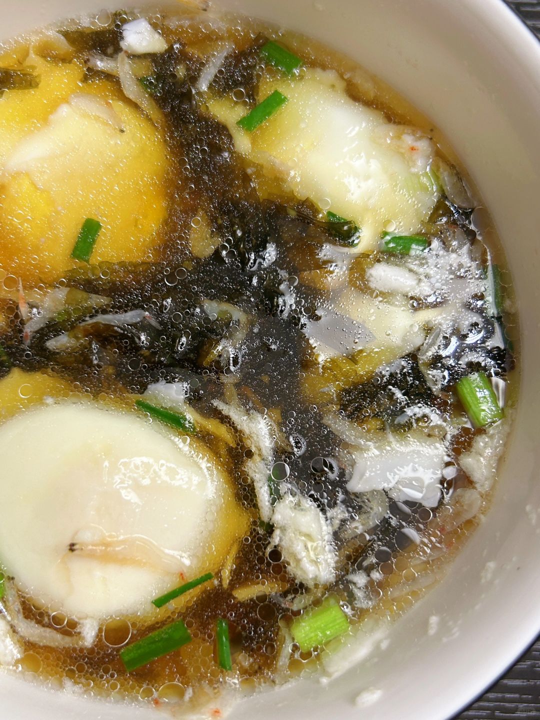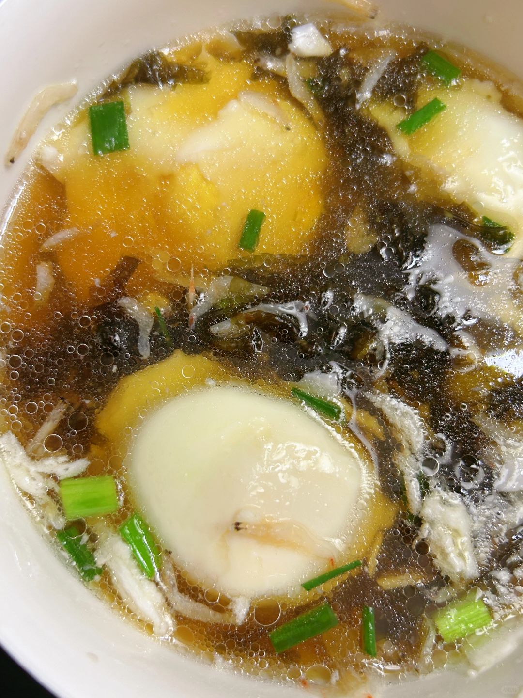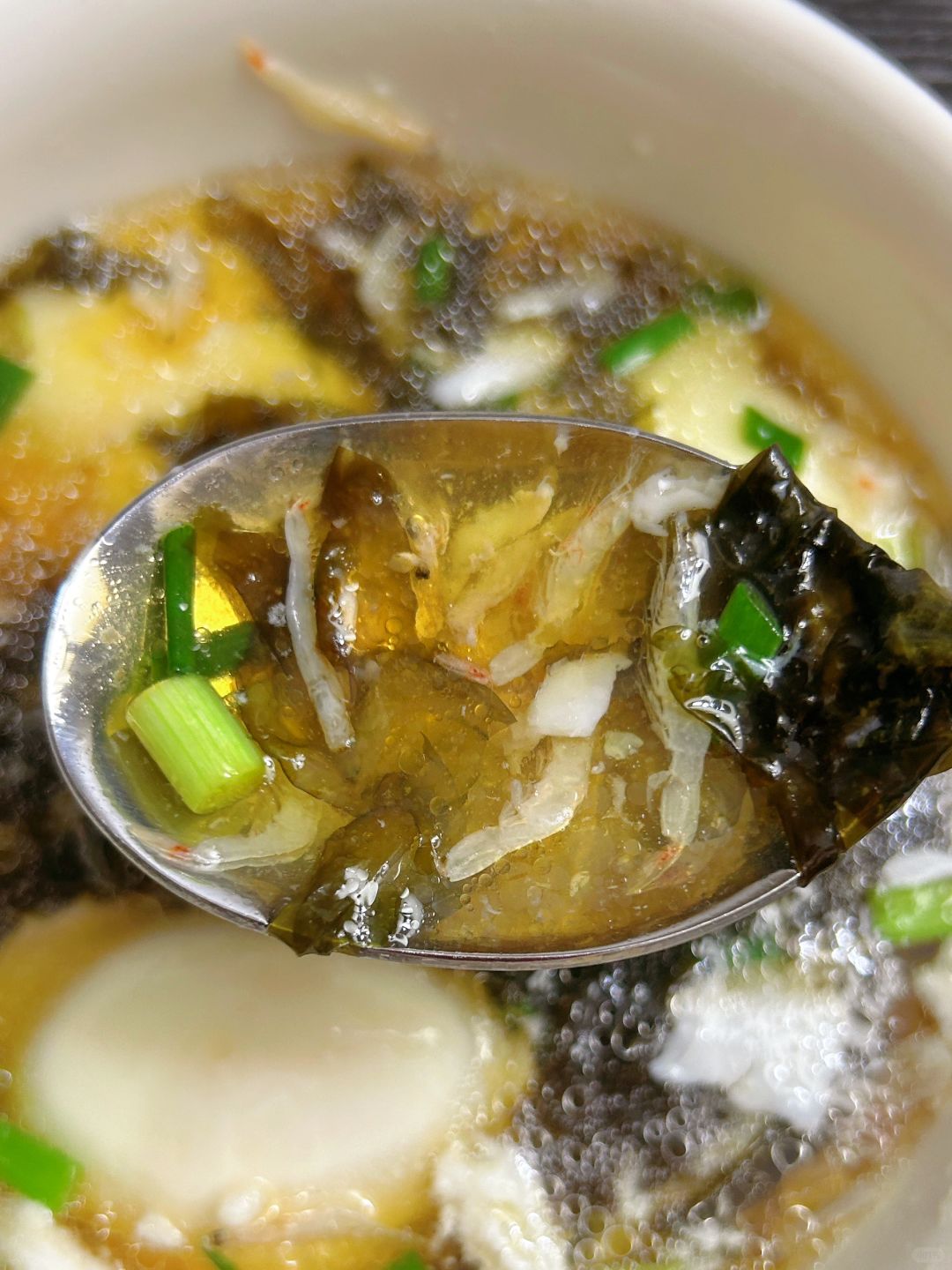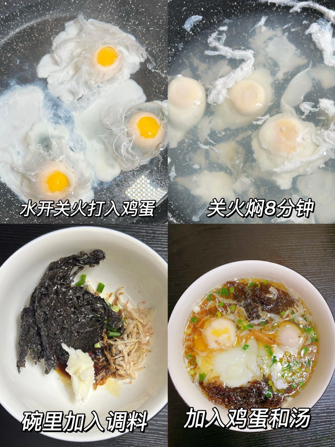 这个懒人拌面 简单又好吃!!! 1⃣️碗里加入葱花、虾皮、紫菜、1勺生抽、1勺陈醋、1勺香油、1勺猪油、半勺盐、1勺鸡精 2️⃣水煮开打入鸡蛋,关火盖盖子焖8分钟,一起倒入碗里 完成✅ 太好吃啦! 汤也很鲜!