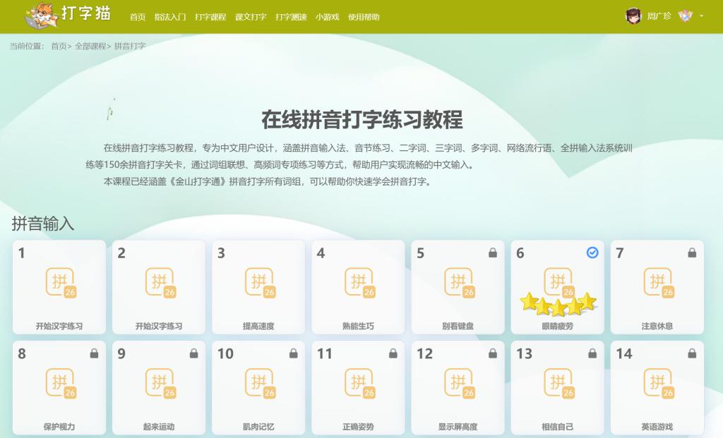 打字猫 —— 集卡式练拼音的“趣味大师”光听名字就知道孩子会喜欢。它把拼音打字变成了“集猫咪卡片”的游戏。每练对一组带拼音的词,比如“苹果(píng guǒ)”“月亮(yuè liang)”,就能解锁一张新猫咪卡片,卡片上还印着这个词的拼音写法,集齐一套特有成就感。