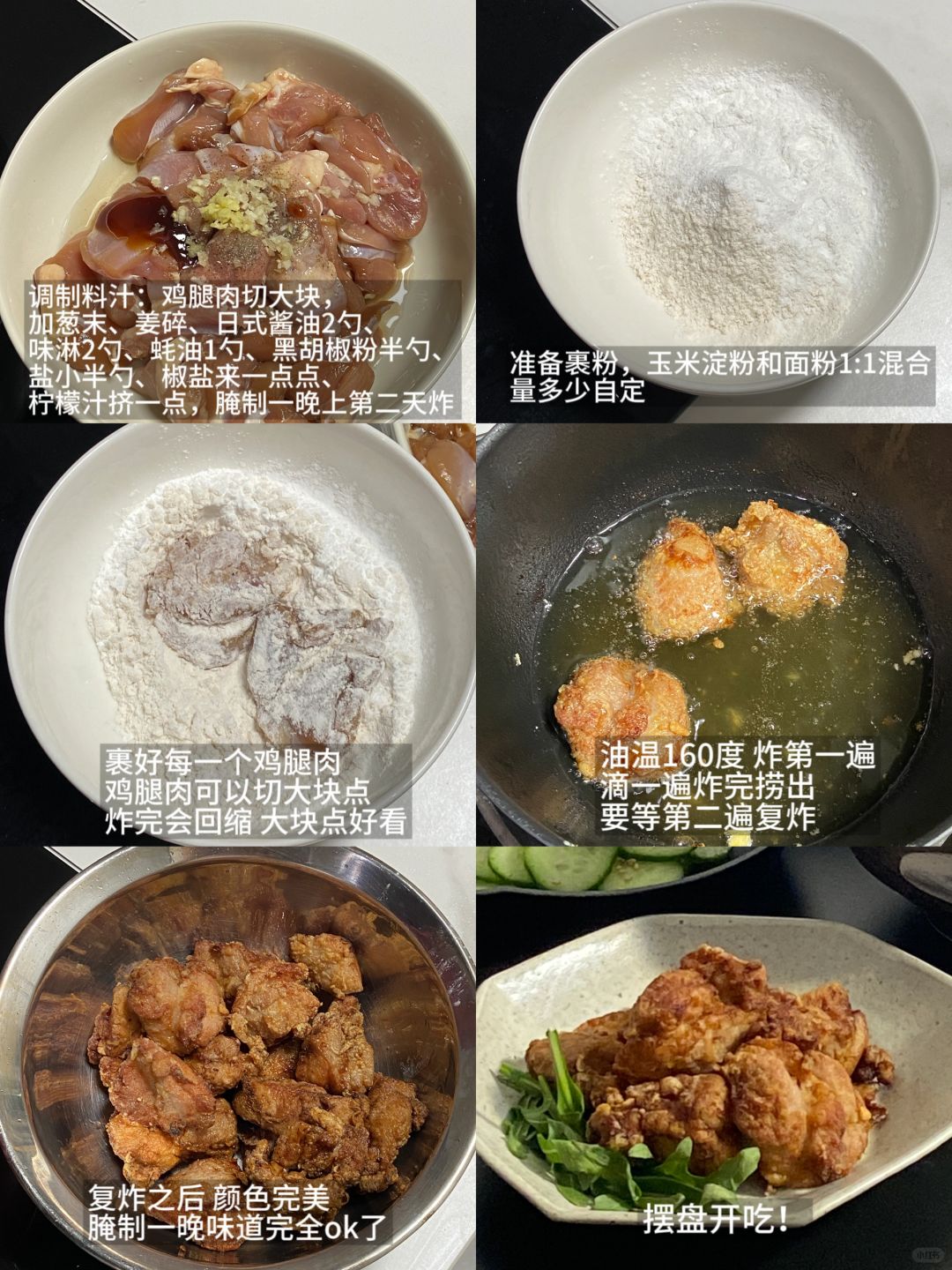 1)调制料汁:鸡腿肉切大块,加葱末、姜碎、日式酱油2勺、味淋2勺、蚝油1勺、黑胡椒粉半勺、盐小半勺、椒盐来一点点、柠檬汁挤一点,腌制一晚上第二天准备炸