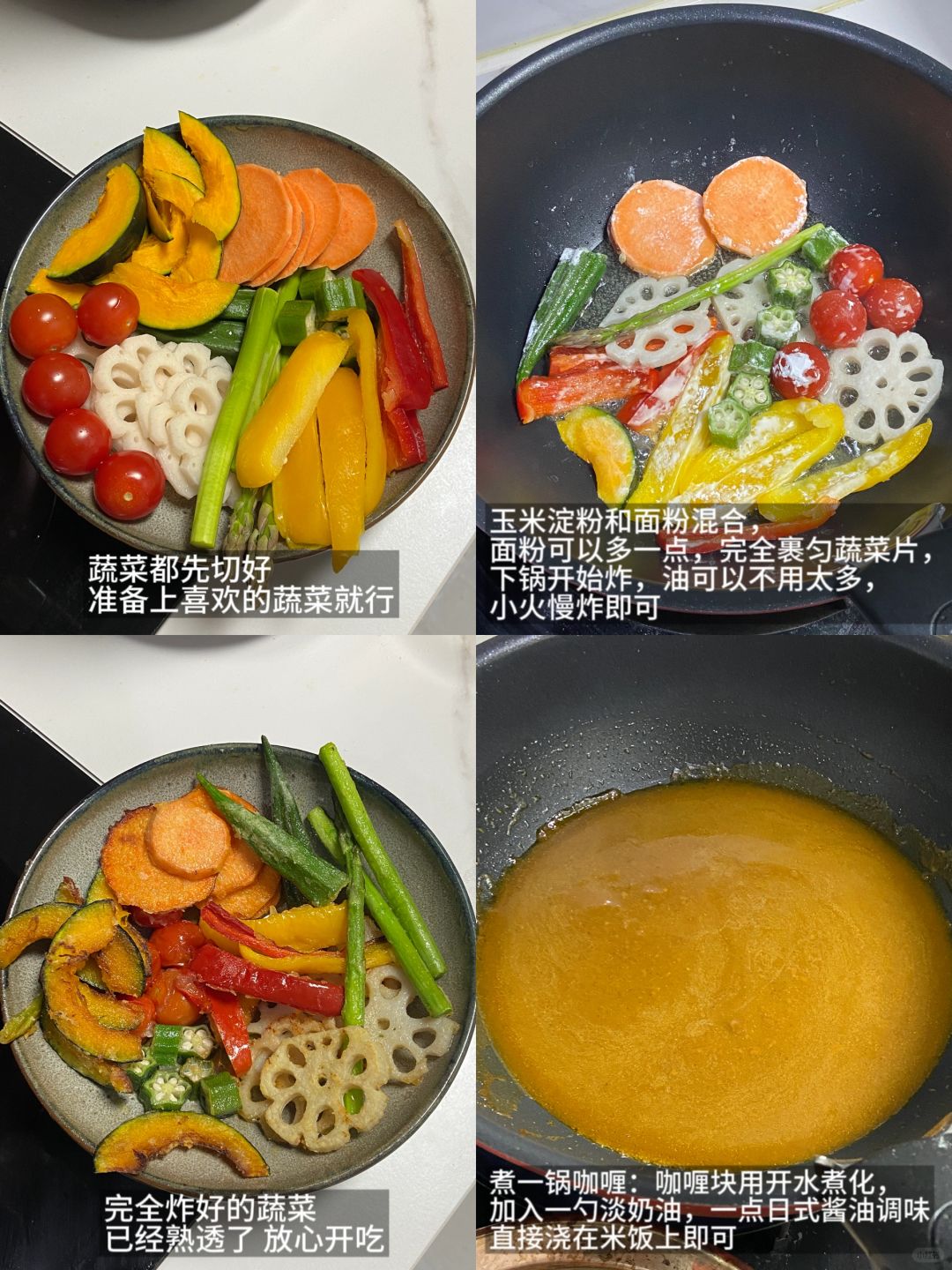 2)准备咖喱,咖喱块用开水煮化,加入一勺淡奶油,一点日式酱油调味,都准备好之后,煮一锅来香喷喷的大米饭,夹上蔬菜炸物,倒在米饭上开吃
