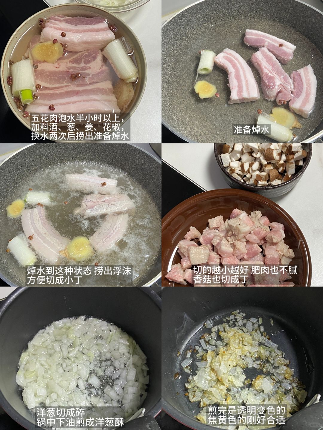 1)五花肉泡水半小时以上,加料酒、葱、姜、花椒,换水两次后捞出准备焯水