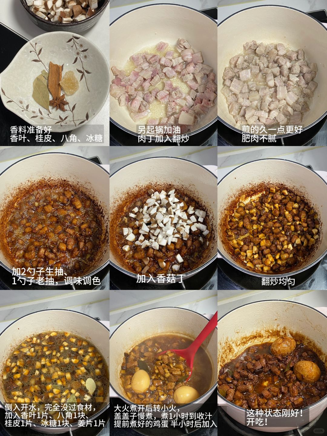 五花肉300g|香菇|洋葱|香叶|八角|桂皮|花椒|冰糖|姜片|葱|生抽|老抽|料酒