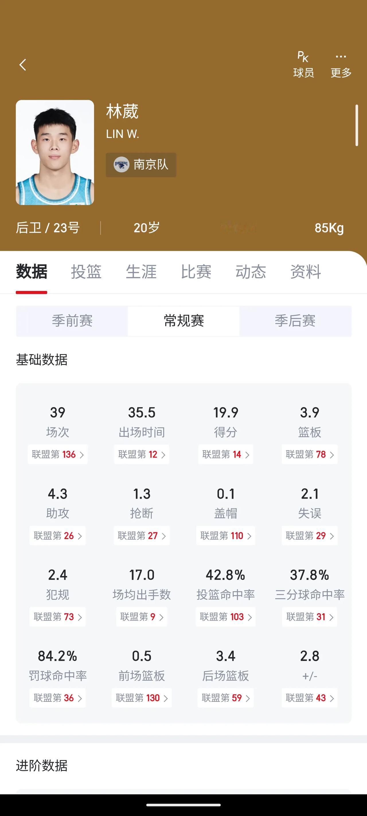20岁的林葳,场均得分接近20分的希望之星,这是本赛季第一次在央视大屏幕上亮相。