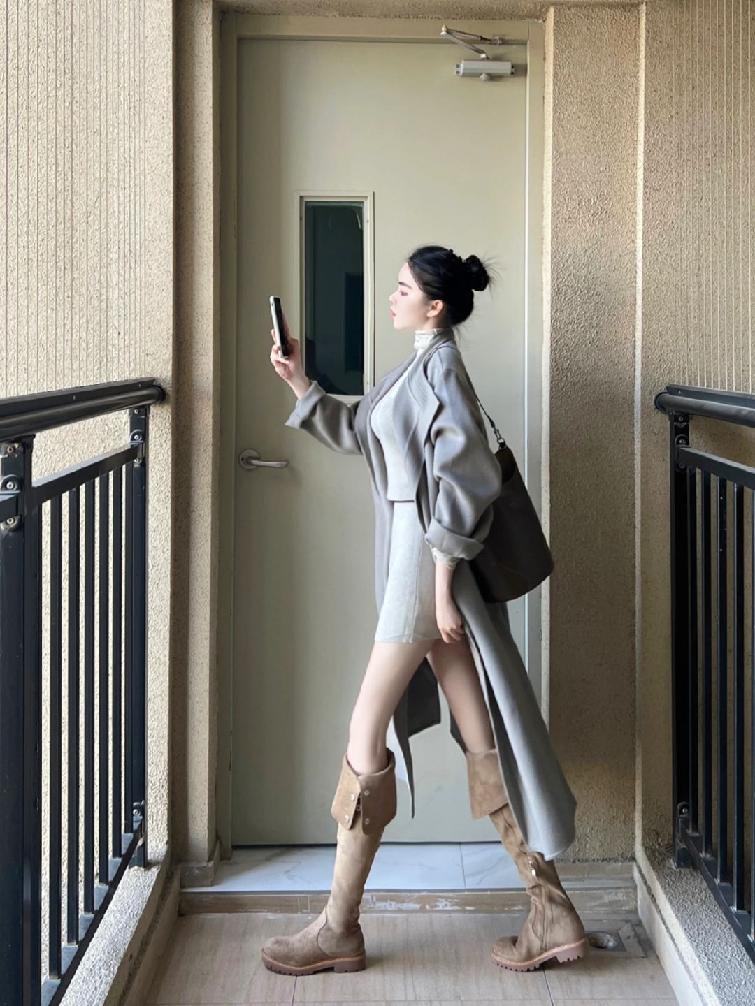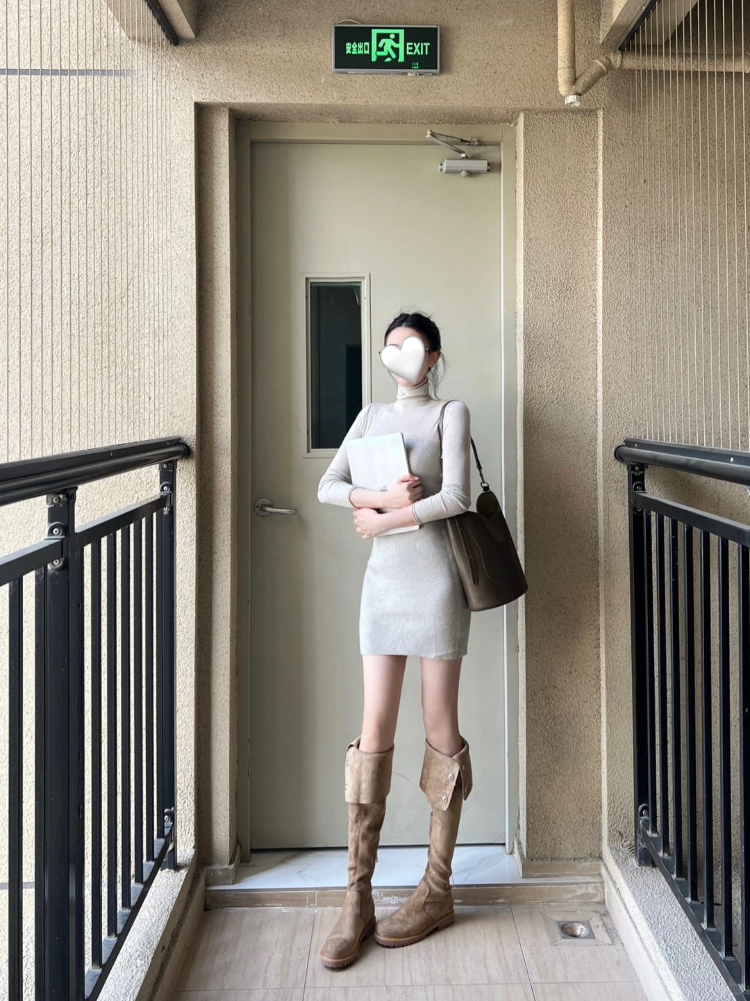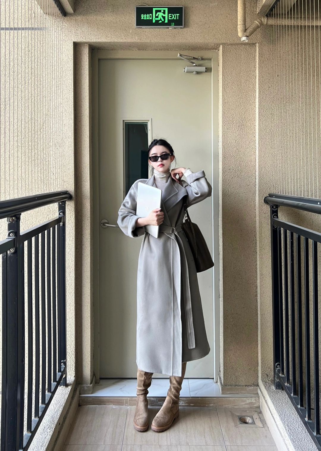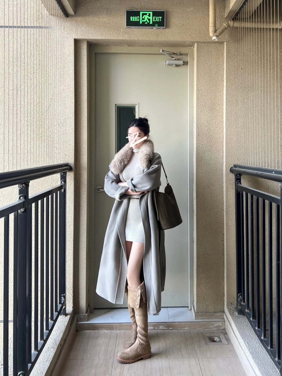 冷灰的长大衣跟杏仁灰的针织裙! 配一双鹿皮绒驼色长靴!清冷高级感穿法!