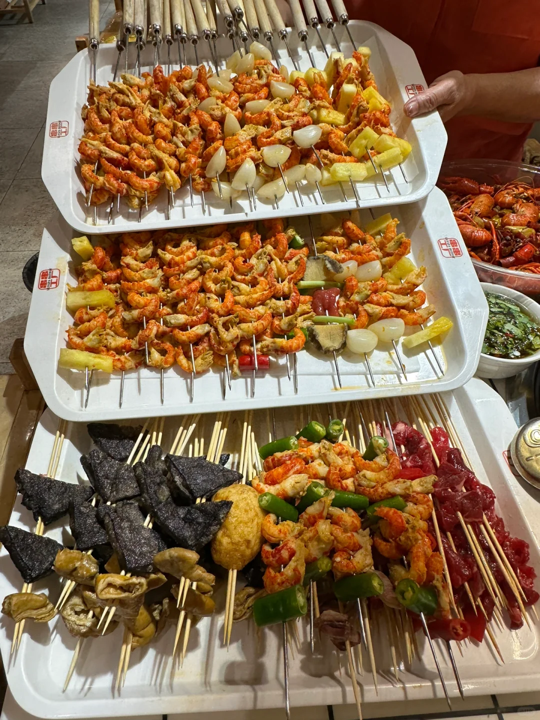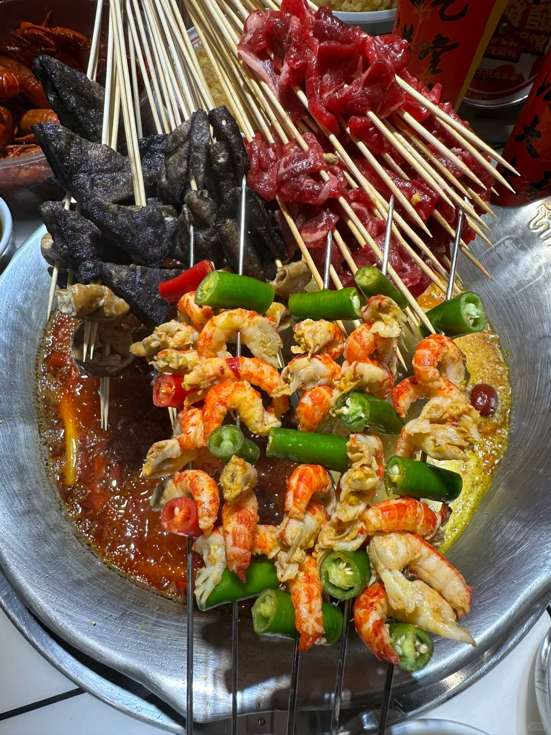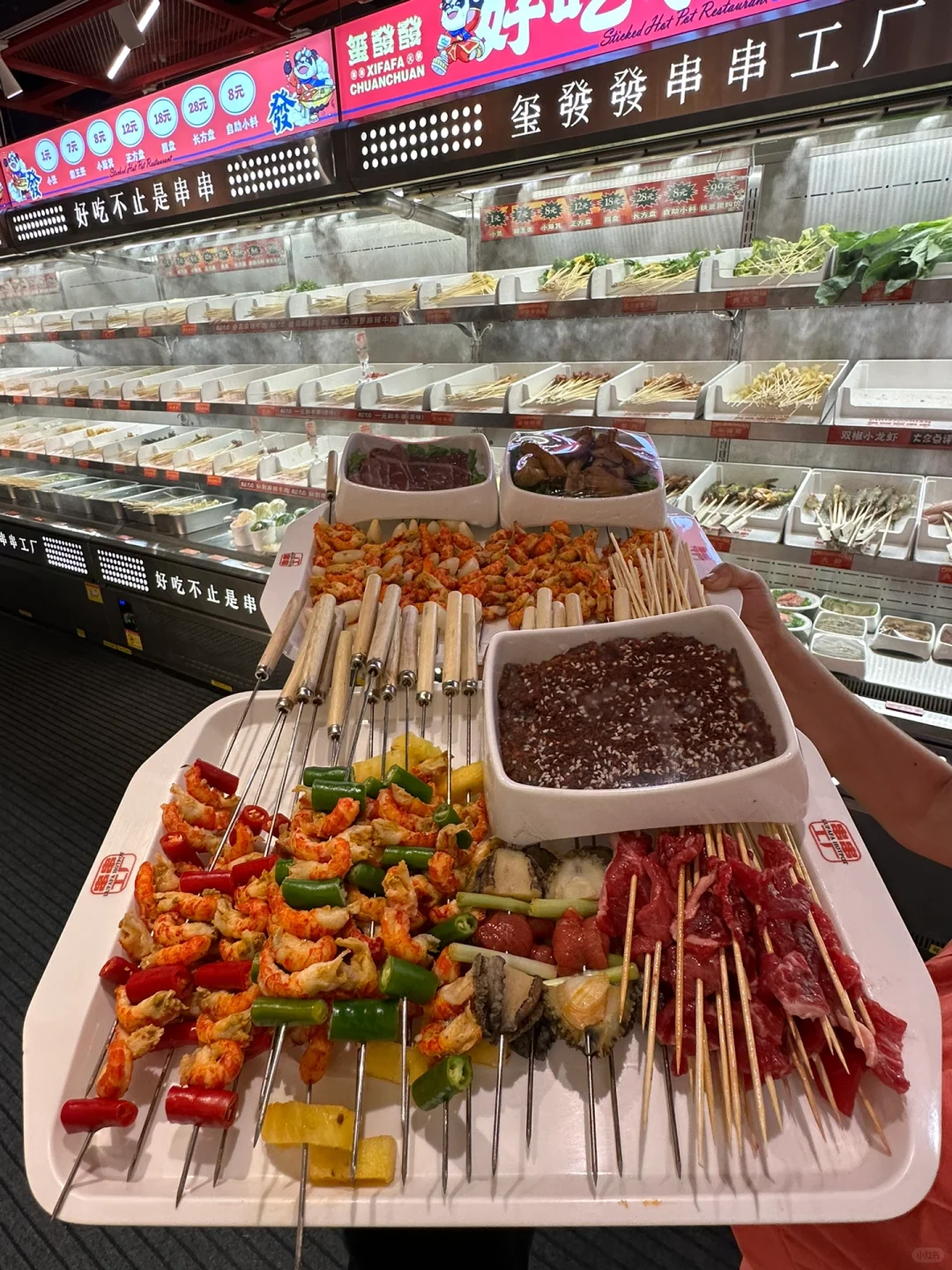 🍢🍢串串的种类超级多,整整一面墙的冰柜装的满满的,荤素全都有,一元一串m5和牛🥩串串,一把一把吃,终于实现了和牛自由啦~菠萝牛肉串、糖蒜牛肉串、紫苏叶牛肉串…串串真的hin丰富,辣锅涮着超入味儿好吃😋