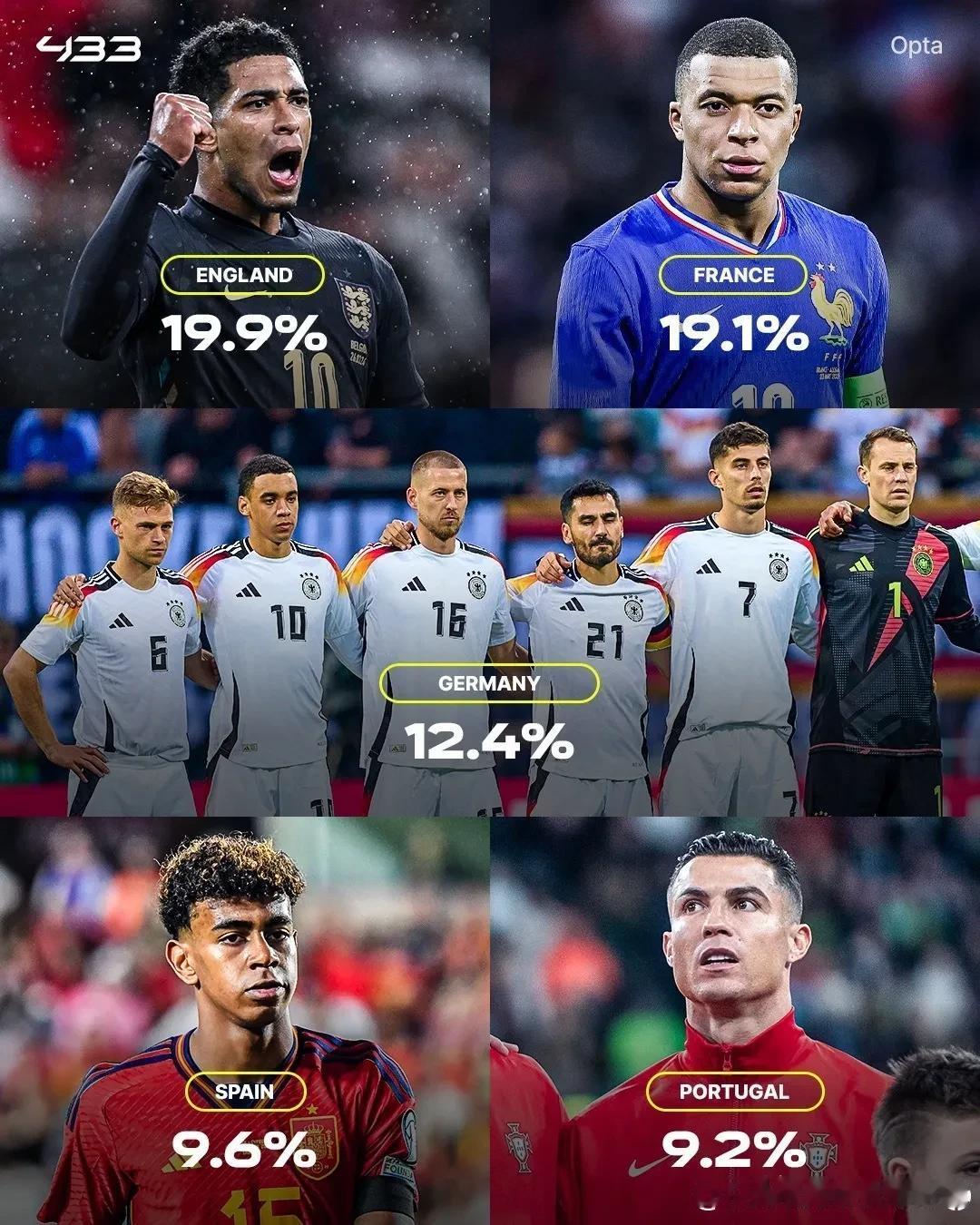 OPTA预测欧洲夺冠机率—— 最大热门——英格兰19.9% 其次上届欧洲杯冠军——法国19.1% 第三东道主——德国队12.4% 青春风暴——西班牙9.6% 星光熠熠——葡萄牙9.2% 你心中的欧洲冠军又是谁?