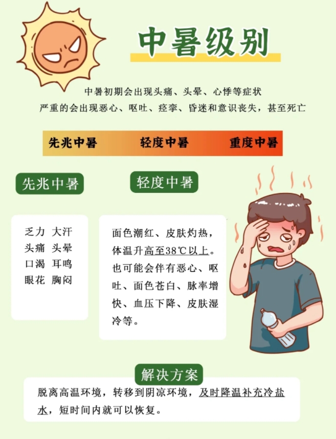 中暑可分为先兆中暑、轻度中暑、重症中暑。