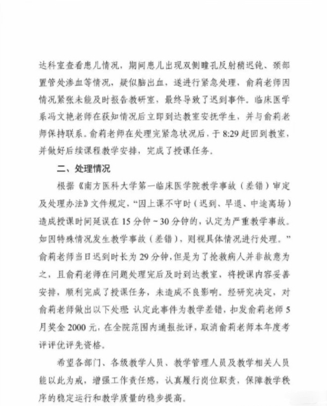 网传南方医科大学的儿科授课老师俞莉因抢救脑出血患儿而耽误了上课,被扣除奖金,通报批评,取消评优资格。