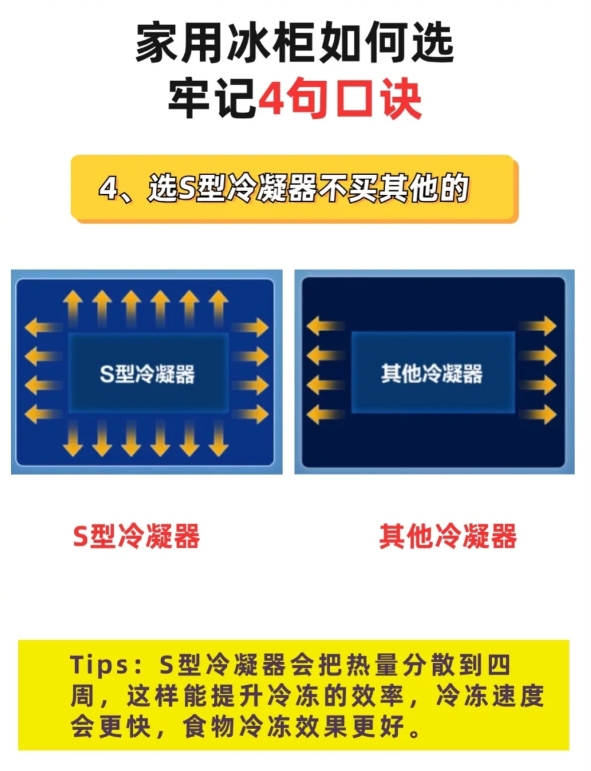 选S型冷凝器的,这样可以很好吧热量分散到四周,制冷效率提高,冷冻效果也不错。