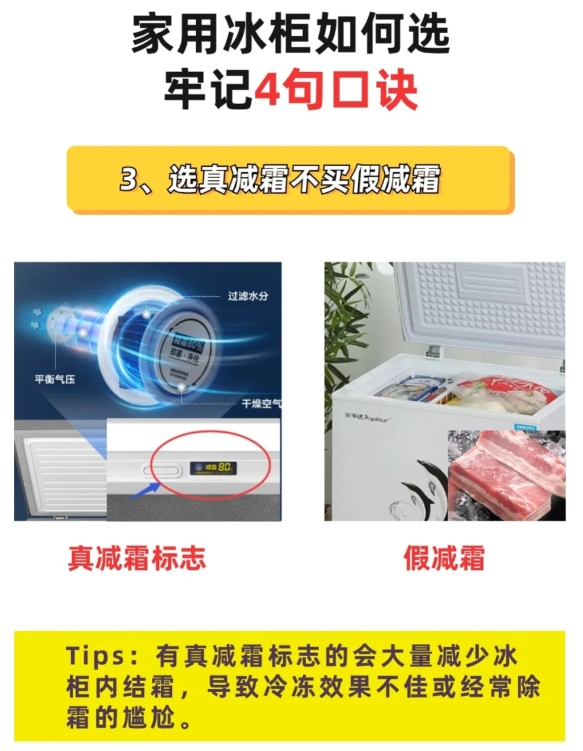选带真减霜标志的,这样不用一天到晚断电除霜,影响食物冷冻效果,还费电。