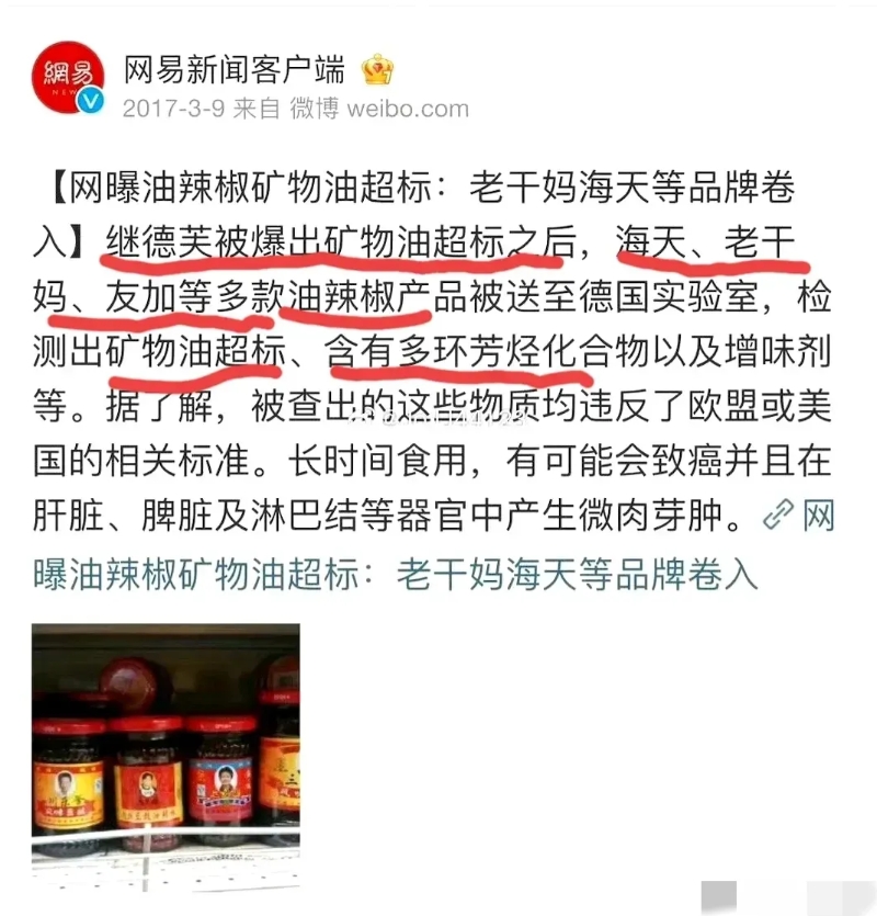 多年前,老干妈的辣椒油,在欧洲被检测出矿物油超标,含有多环芳仅化合物。