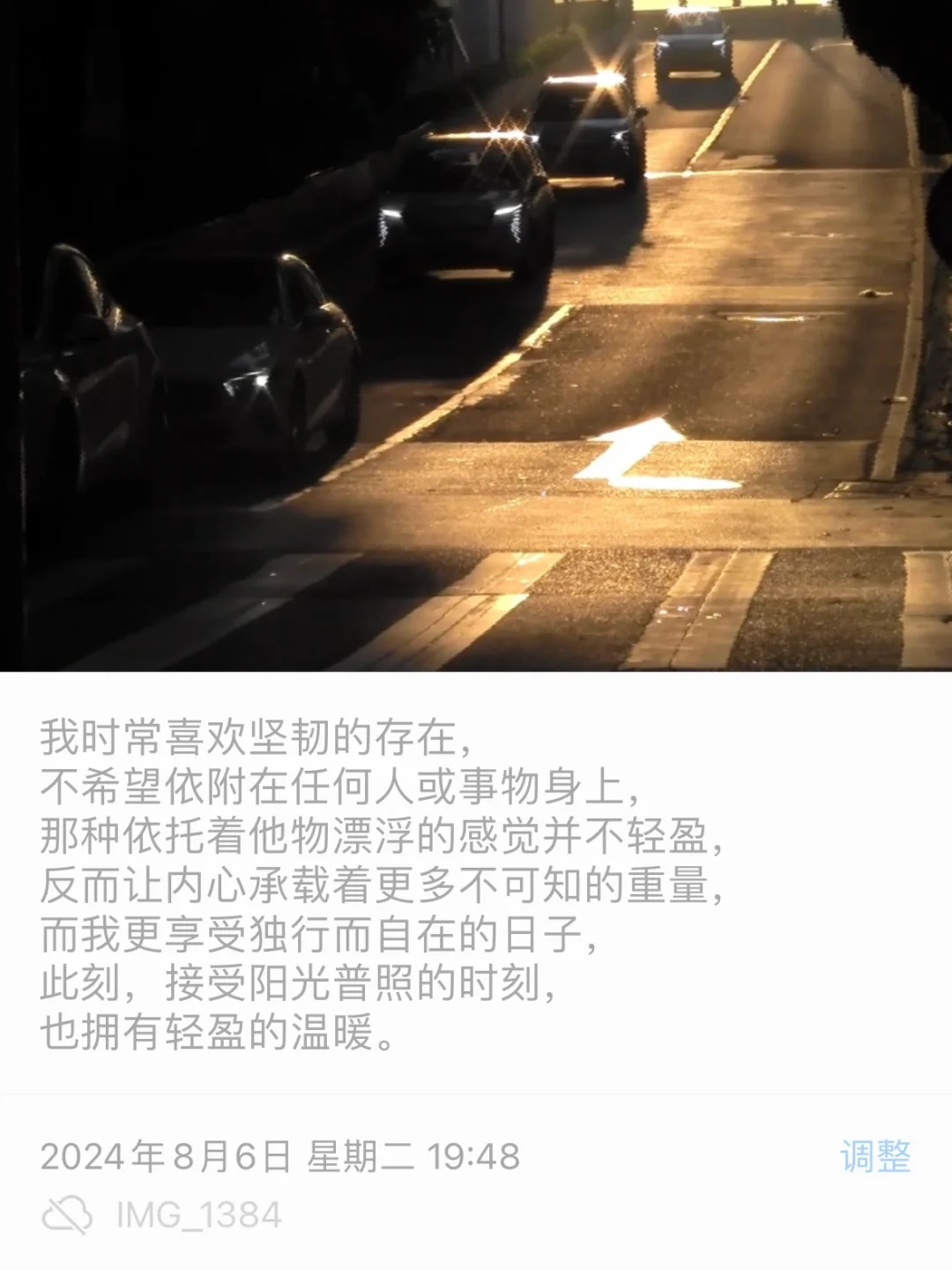 我时常喜欢坚韧的存在, 不希望依附在任何人或事物身上, 那种依托着他物漂浮的感觉并不轻盈, 反而让内心承载着更多不可知的重量, 而我更享受独行而自在的日子, 此刻,接受阳光普照的时刻, 也拥有轻盈的温暖。 · 我偶尔向往柔软的存在, 温暖的光束,鲜艳的颜色, 生命的质感拥有真实的热烈。 · 在夏天, 在夏天的黄昏, 我最为炽热而柔软, 当温暖的光束洒落身上, 洒落在目之所及的大地上, 我似乎可以理解我所有的想象。 · 在读《去有花的地方》 · 感谢观看, 祝你生活愉快! ·
