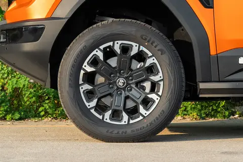 前脸的设计很有特点,矩形中网搭配可点亮的品牌 LOGO,到了晚上辨识度很高;凸出的保险杠是个很实用的设计,不仅能提升通过性,后期万一磕碰到,维修成本也相对较低,能看出工程师是从实际使用场景出发做的考量。