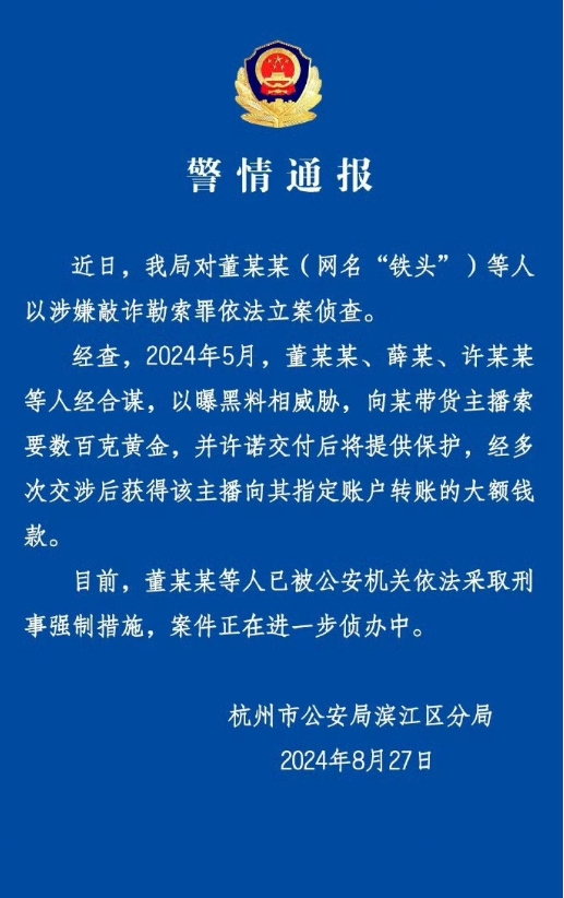 8月27日,杭州市公安局发布通报:对董某某(网名“铁头”)等人以涉嫌敲诈勒索罪依法立案侦查。