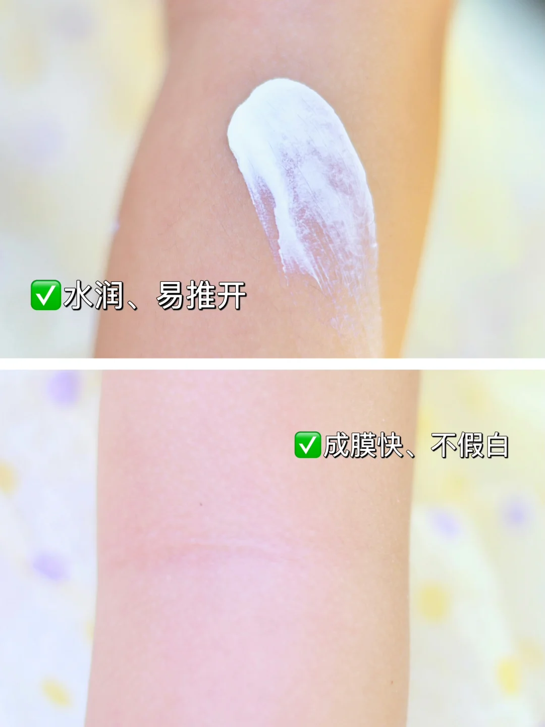 水润、轻薄~透气不闷涂完后不假白不厚重、玩上一整天小脸儿也不会粘腻。