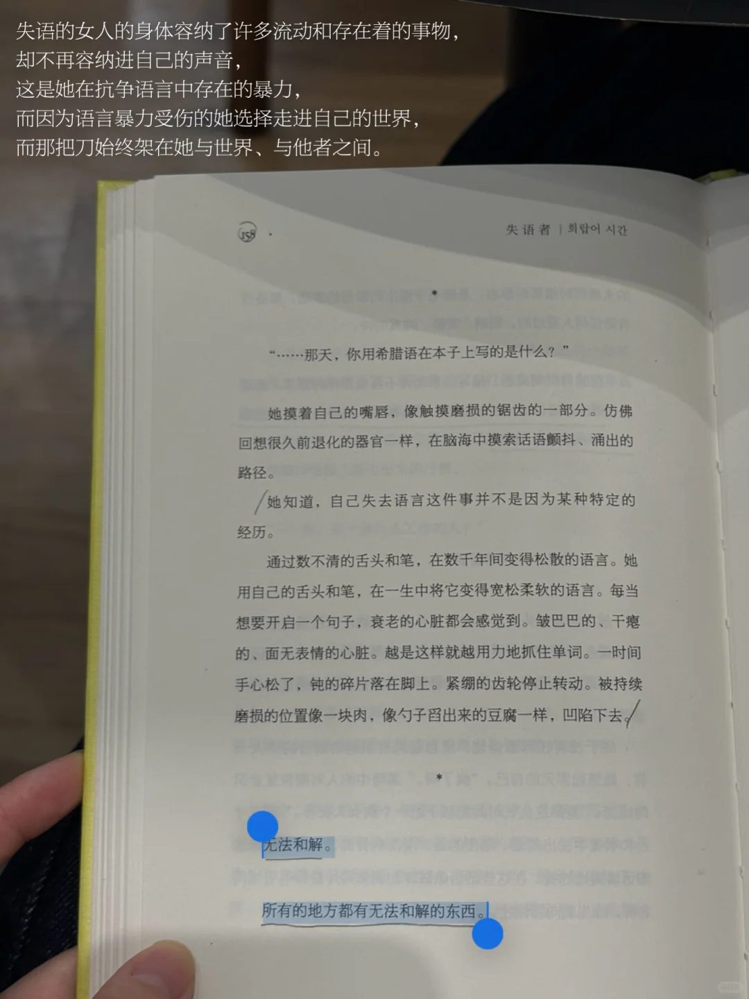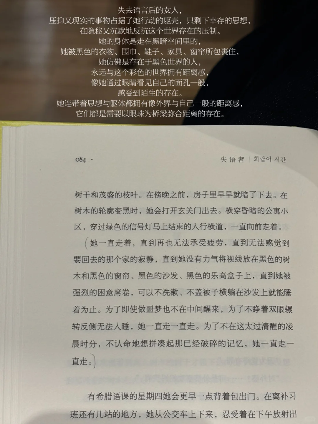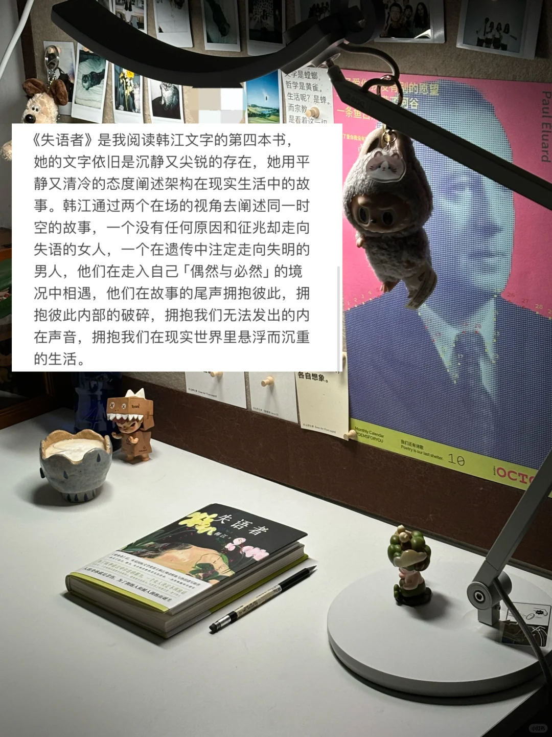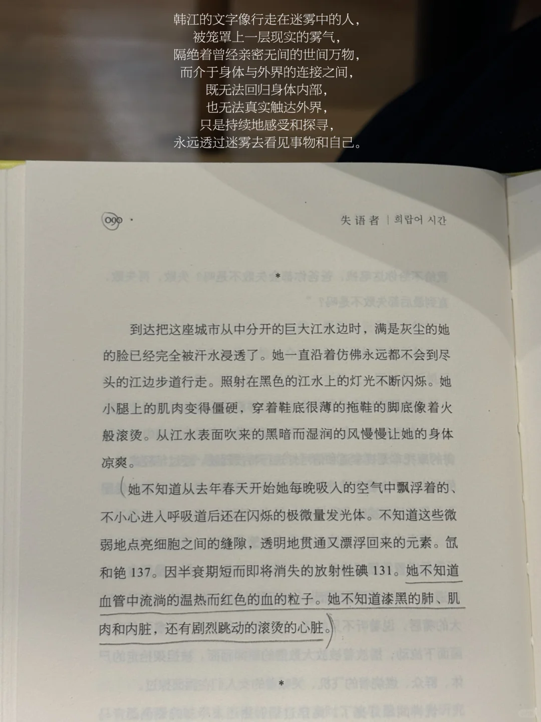 《失语者》是我阅读韩江文字的第 四本书,她的文字依旧是沉静又尖锐的存在,她用平静又清冷的态度阐述架构在现实生活中的故事。韩江通过两个在场的视角去阐述同一时空的故事,一个没有任何原因和征兆却走向失语的女人,一个在遗传中注定走向失明的男人,他们在走入自己「偶然与必然」的境况中相遇,他们在故事的尾声拥抱彼此,拥抱彼此内部的破碎,拥抱我们无法发出的内在声音,拥抱我们在现实世界里悬浮而沉重的生活。
