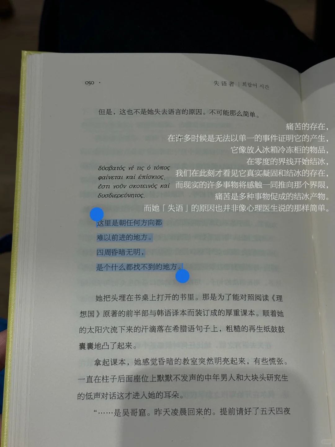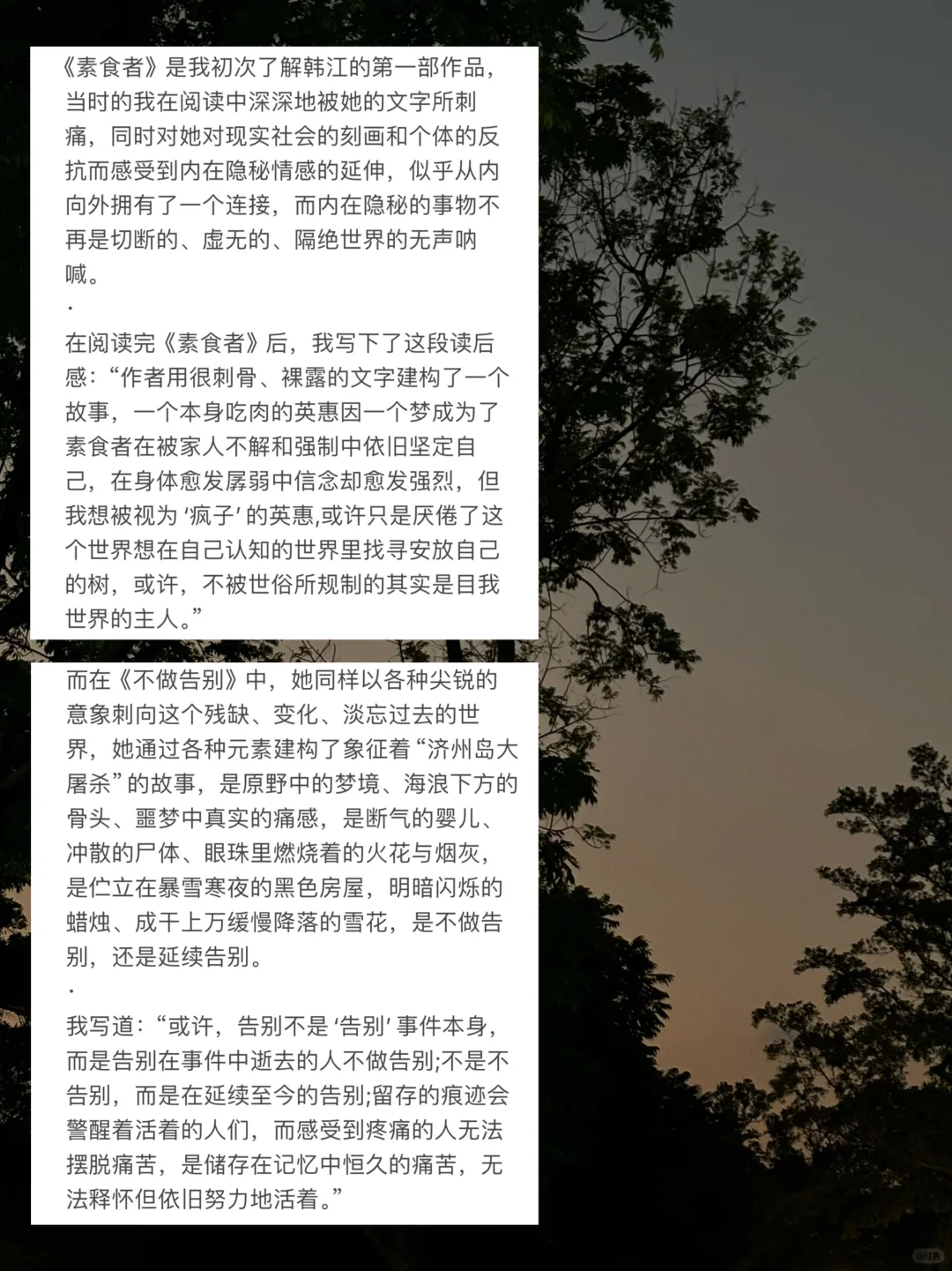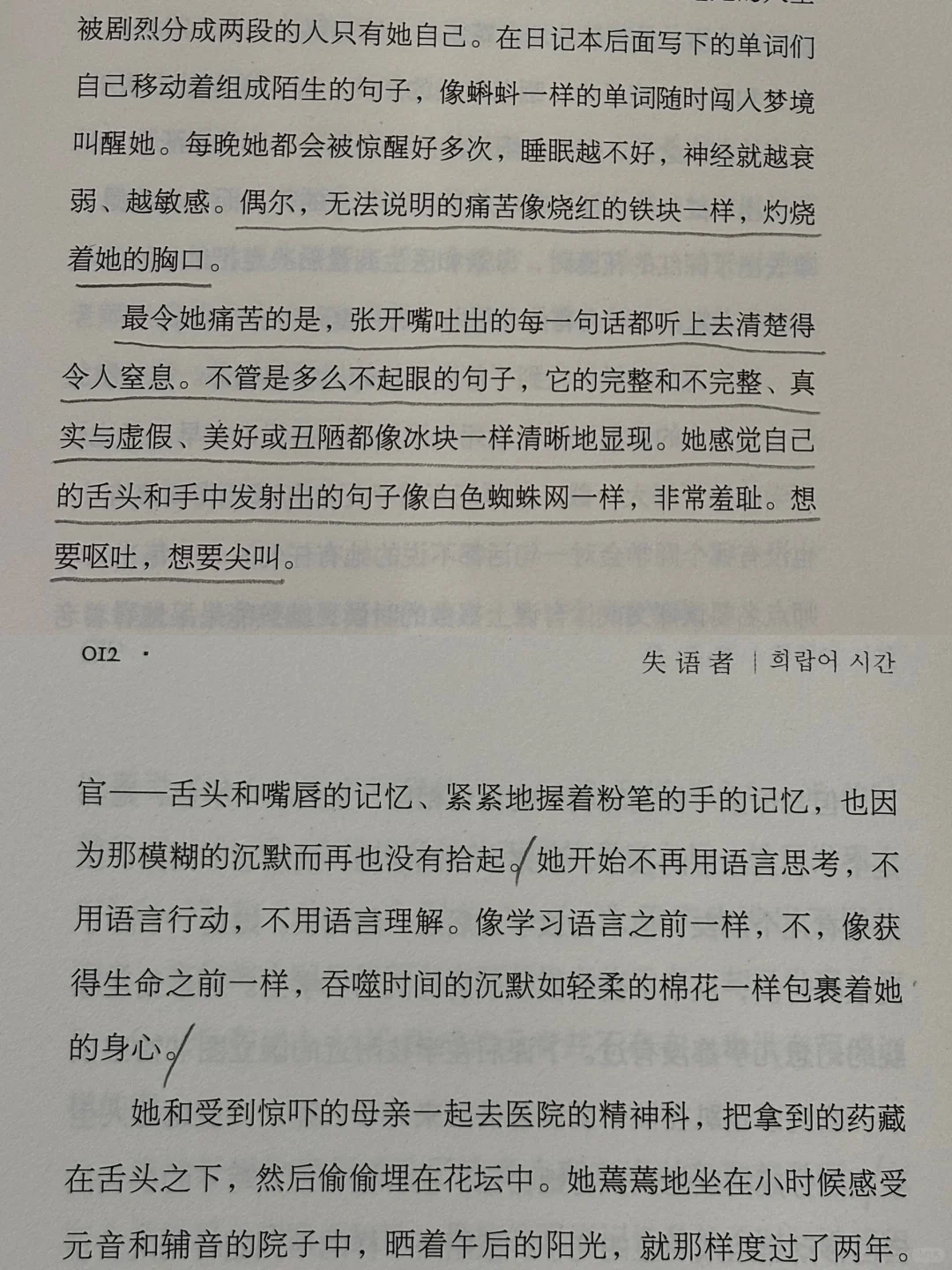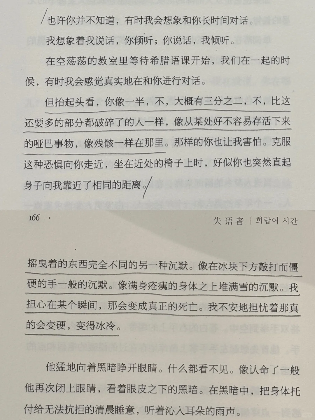 《失语者》是我阅读韩江文字的第 四本书,她的文字依旧是沉静又尖锐的存在,她用平静又清冷的态度阐述架构在现实生活中的故事。韩江通过两个在场的视角去阐述同一时空的故事,一个没有任何原因和征兆却走向失语的女人,一个在遗传中注定走向失明的男人,他们在走入自己「偶然与必然」的境况中相遇,他们在故事的尾声拥抱彼此,拥抱彼此内部的破碎,拥抱我们无法发出的内在声音,拥抱我们在现实世界里悬浮而沉重的生活。
