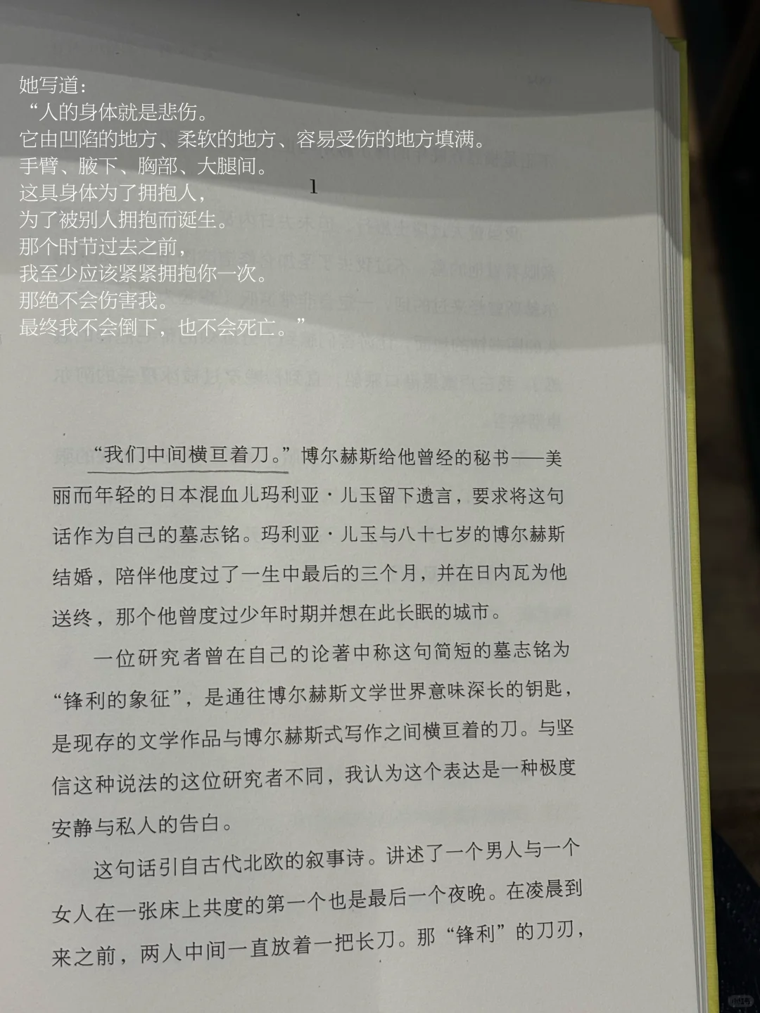 “人的身体就是悲伤。它由凹陷的地方、柔软的地方、容易受伤的地方填满。手臂、腋下、胸部、大腿间。这具身体为了拥抱人,为了被别人拥抱而诞生。那个时节过去之前,我至少应该紧紧拥抱你一次。那绝不会伤害我。最终我不会倒下,也不会死亡。”