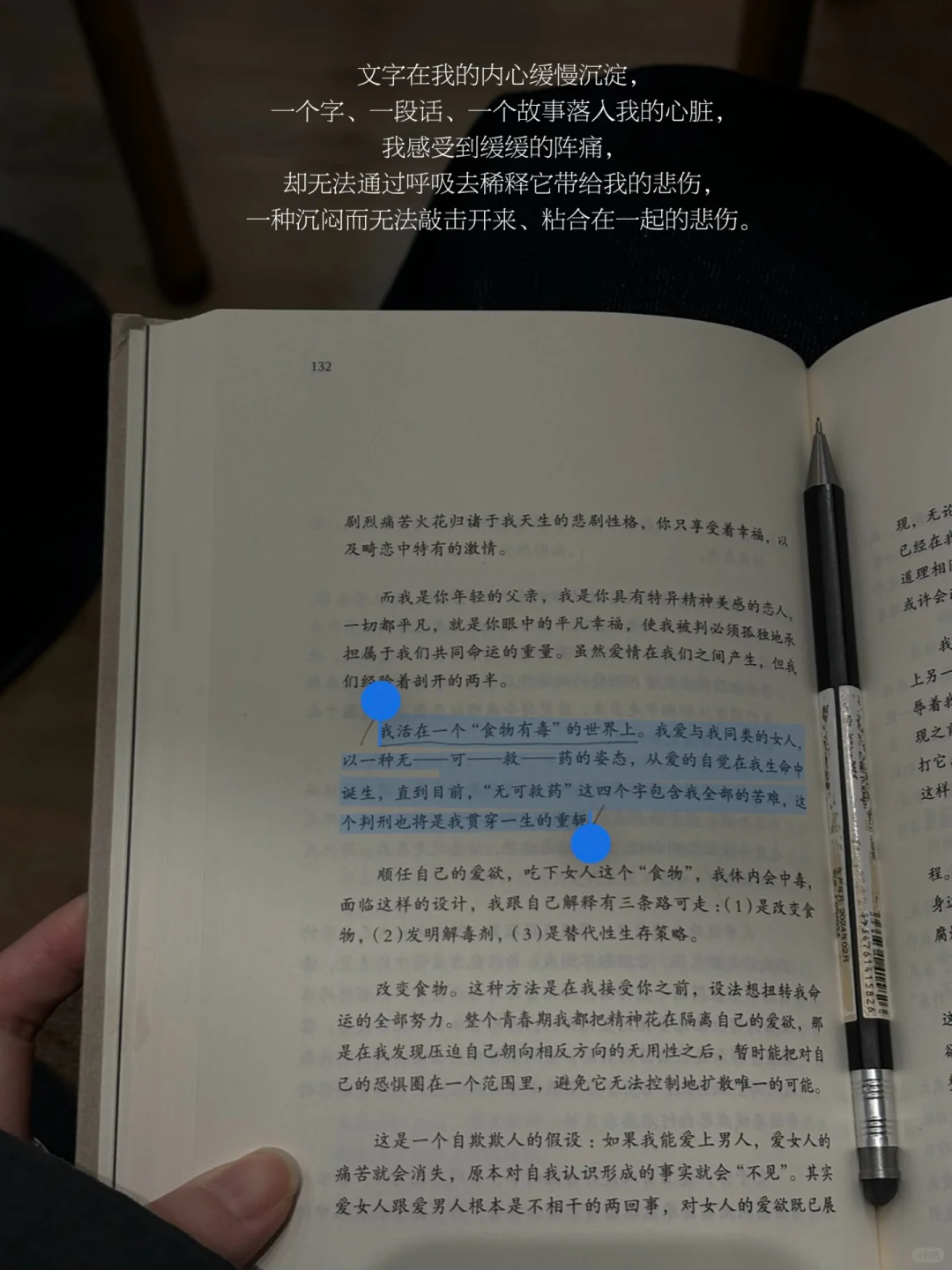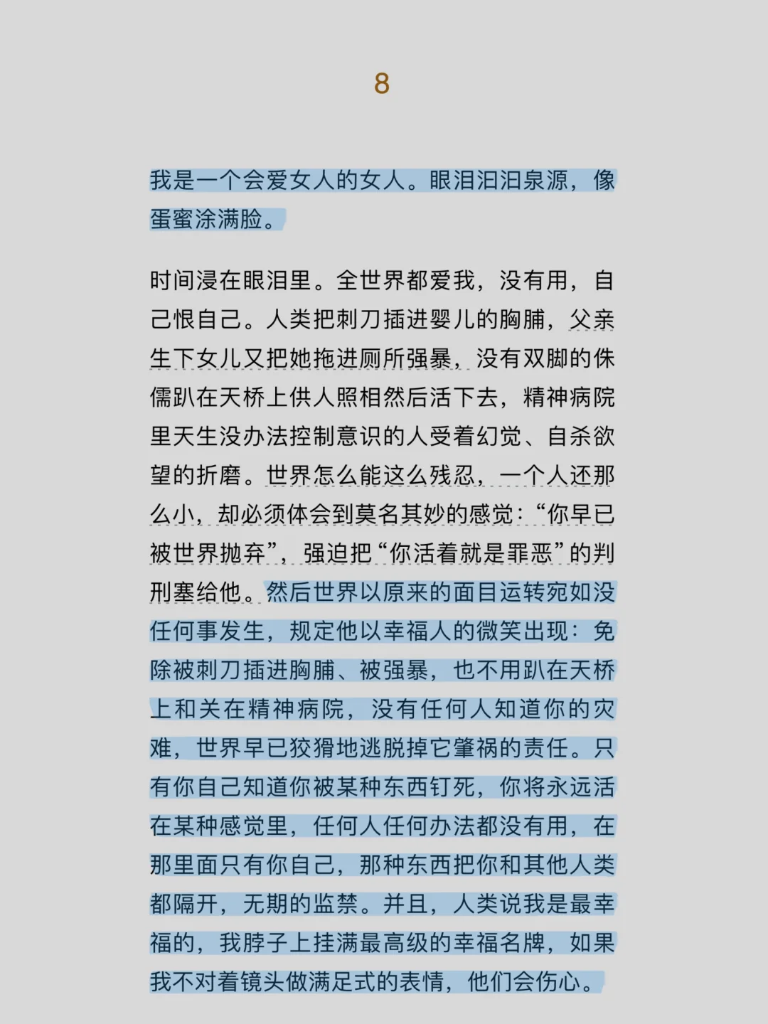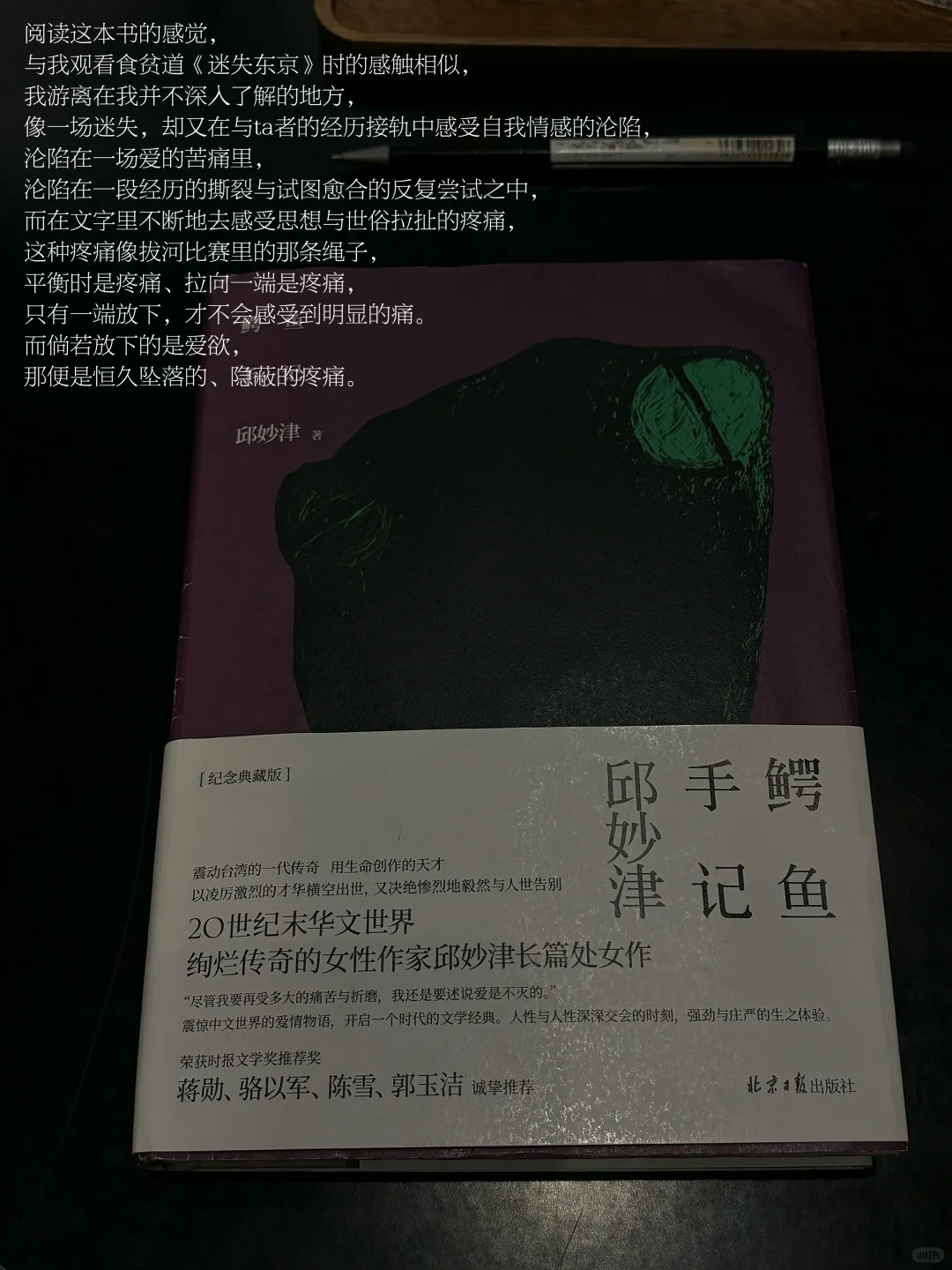 阅读这本书的感觉,与我观看食贫道《迷失东京》时的感触相似,我游离在我并不深入了解的地方,像一场迷失,却又在与ta者的经历接轨中感受自我情感的沦陷,沦陷在一场爱的苦痛里,沦陷在一段经历的撕裂与试图愈合的反复尝试之中,而在文字里不断地去感受思想与世俗拉扯的疼痛,这种疼痛像拔河比赛里的那条绳子,平衡时是疼痛、拉向一端是疼痛,只有一端放下,才不会感受到明显的痛。而倘若放下的是爱欲,那便是恒久坠落的、隐蔽的疼痛。