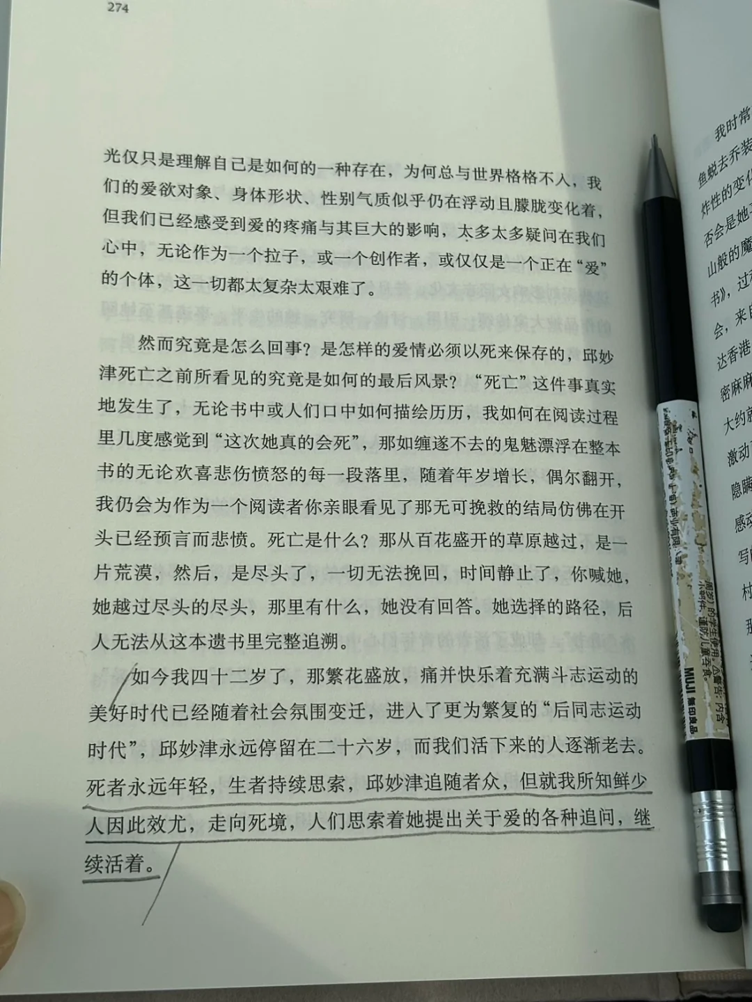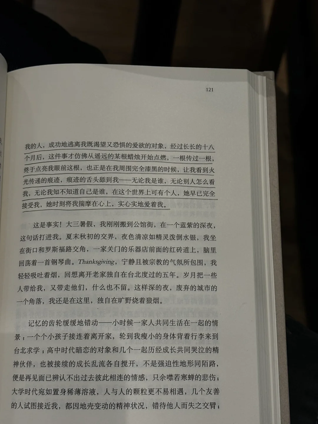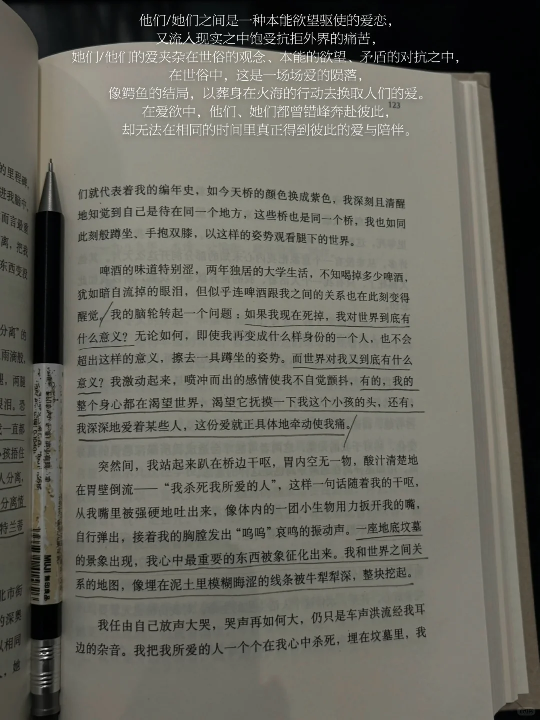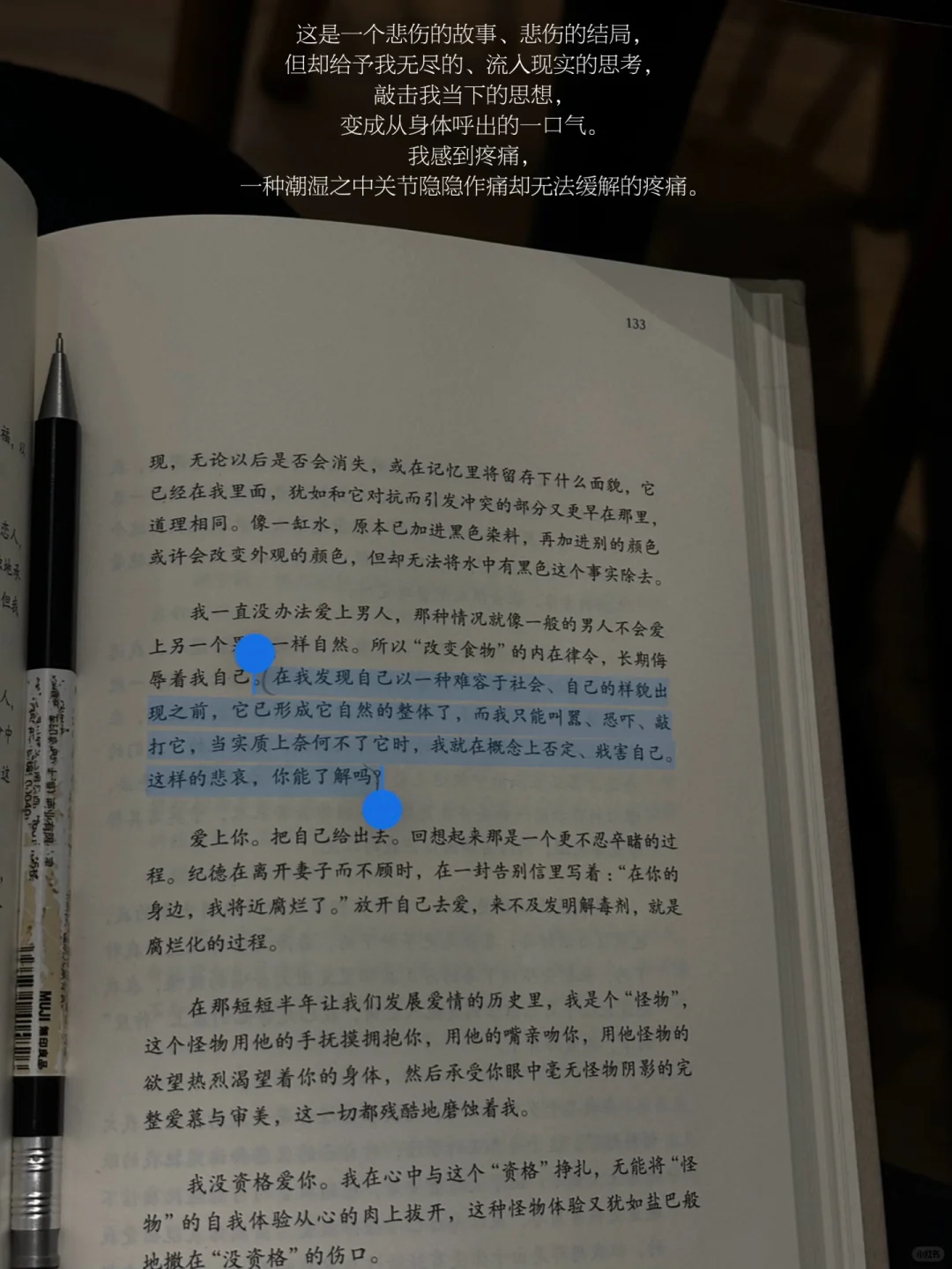 阅读这本书的感觉,与我观看食贫道《迷失东京》时的感触相似,我游离在我并不深入了解的地方,像一场迷失,却又在与ta者的经历接轨中感受自我情感的沦陷,沦陷在一场爱的苦痛里,沦陷在一段经历的撕裂与试图愈合的反复尝试之中,而在文字里不断地去感受思想与世俗拉扯的疼痛,这种疼痛像拔河比赛里的那条绳子,平衡时是疼痛、拉向一端是疼痛,只有一端放下,才不会感受到明显的痛。而倘若放下的是爱欲,那便是恒久坠落的、隐蔽的疼痛。
