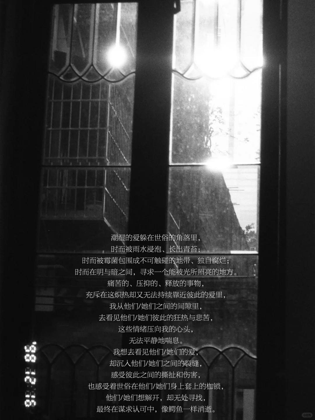 潮湿的爱躲在世俗的角落里,时而被雨水浸泡、长出青苔;时而被霉菌包围成不可触碰的地带、独自腐烂;时而在明与暗之间,寻求一个能被光所照亮的地方。痛苦的、压抑的、释放的事物,充斥在这炽热却又无法持续靠近彼此的爱里,我从他们/她们之间的间隙里,去看见他们/她们彼此的狂热与悲苦,