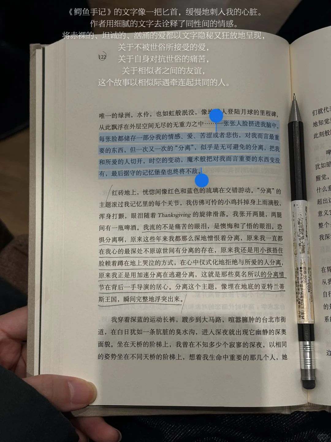 《鳄鱼手记》的文字像一把匕首,缓慢地刺入我的心脏。作者用细腻的文字去诠释了同性间的情感。将赤裸的、坦诚的、汹涌的爱都以文字隐秘又狂放地呈现,关于不被世俗所接受的爱,关于自身对抗世俗的痛苦,关于相似者之间的友谊,这个故事以相似际遇牵连起共同的人。