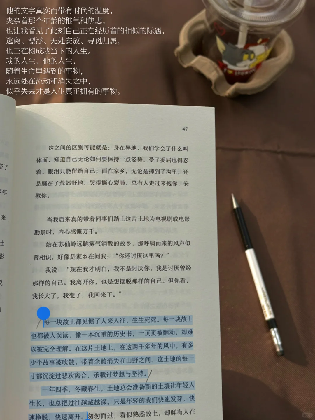 他的文字真实而带有时代的温度,夹杂着那个年龄的稚气和焦虑,也让我看见了此刻自己正在经历着的相似的际遇,逃离、漂浮、无处安放、寻觅归属,也正在构成我当下的人生。我的人生、他的人生,随着生命里遇到的事物,永远处在流动和消失之中,似乎失去才是人生真正拥有的事物。