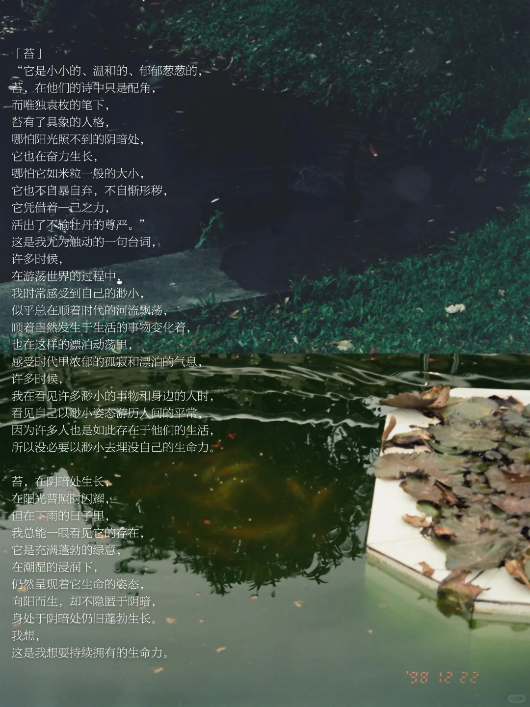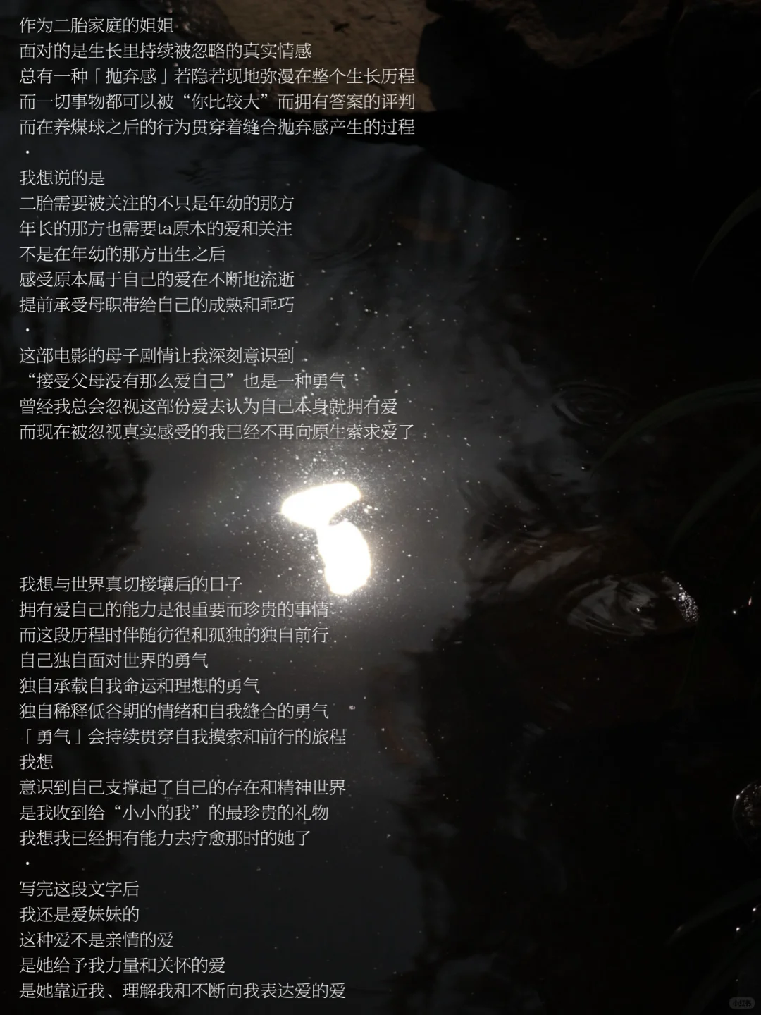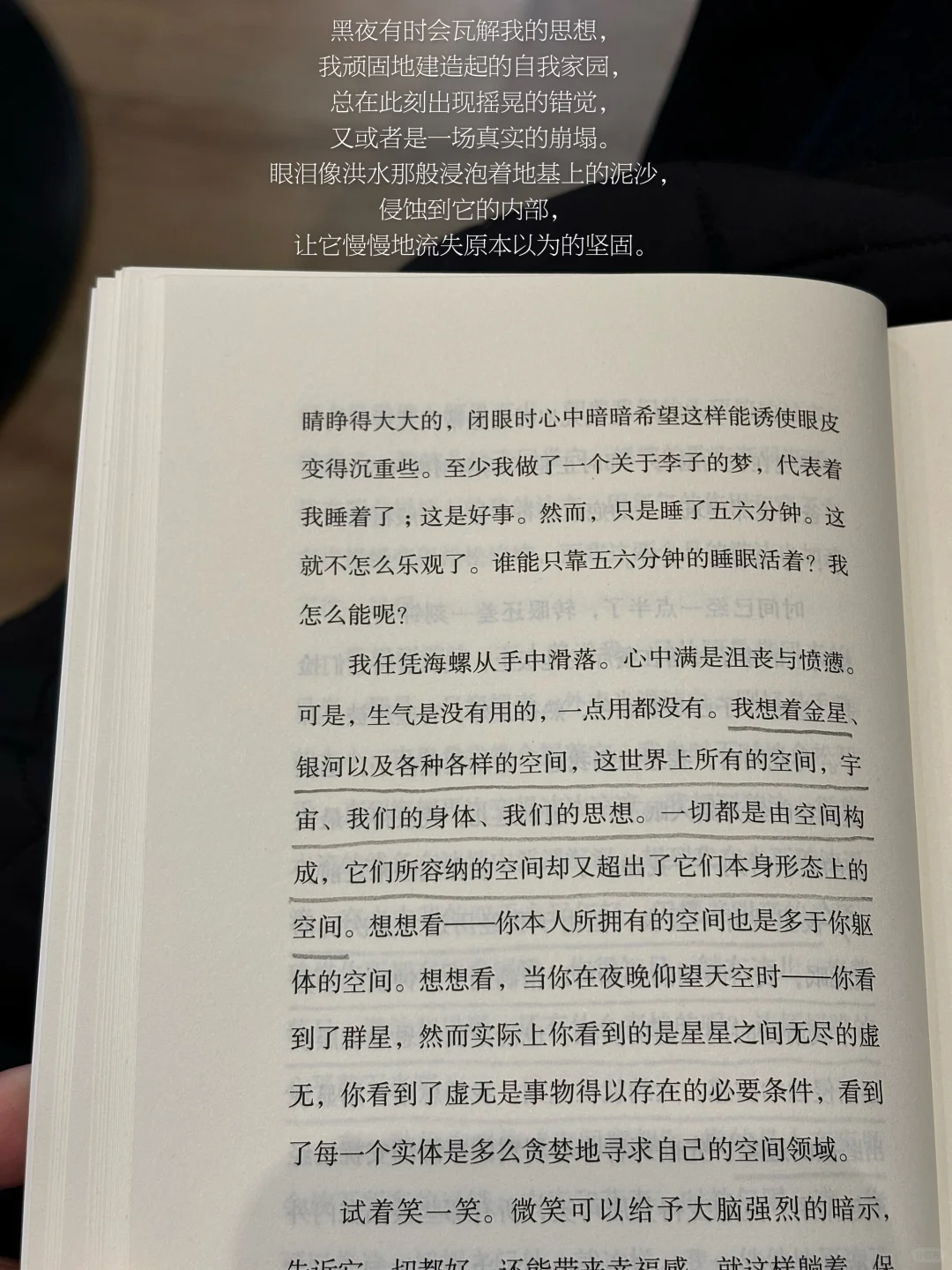 黑夜有时会瓦解我的思想,我顽固地建造起的自我家园,总在此刻出现摇晃的错觉,又或者是一场真实的崩塌,眼泪像洪水那般浸泡着地基上的泥沙,侵蚀到它的内部,让它慢慢地流失原本以为的坚固,失眠的时刻总是充盈着情绪和回忆,这是一场盛大的梳理自我和情感的过程。