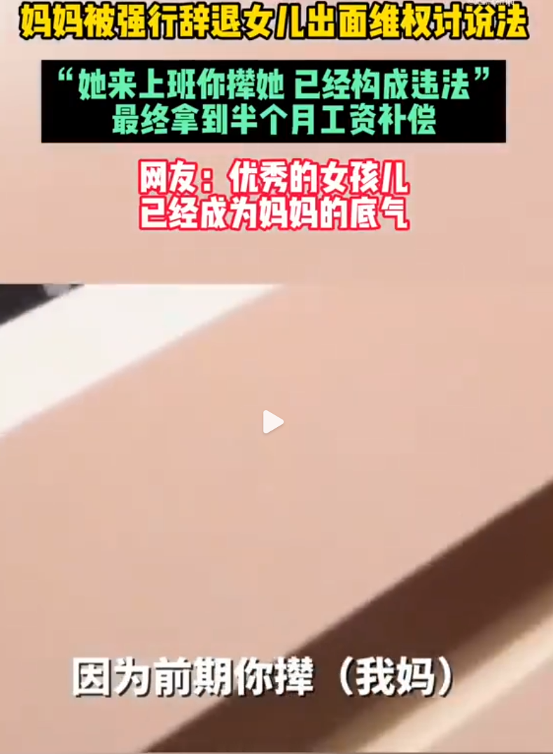 近日,北京一网友分享经历,其母亲在公司上班时突遭无理由辞退且未获补偿。该网友挺身而出,与公司进行谈判,最终成功为母亲争取到半个月工资的补偿。网友纷纷点赞:“知法懂法,女儿真是妈妈最大的底气!”