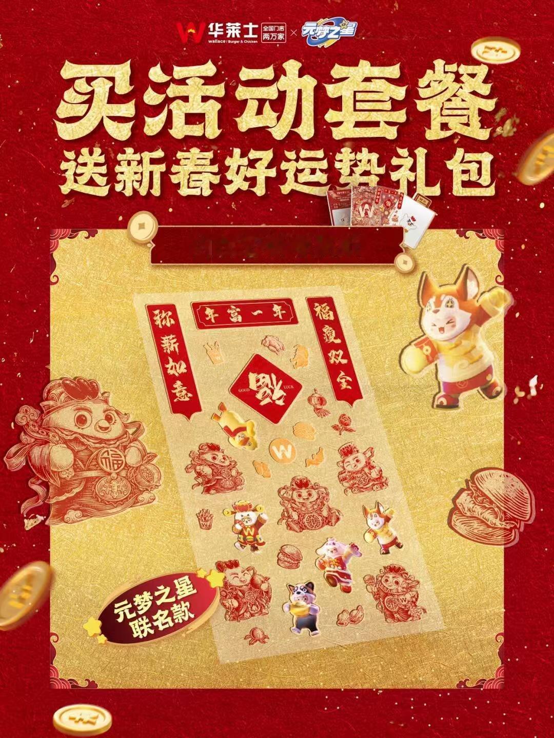 告诉你们个超应景的事!华莱士在新年推出了新春套餐,小程序下单就有机会中大奖,新的一年必须红火,新春贴纸红包我必拿下!