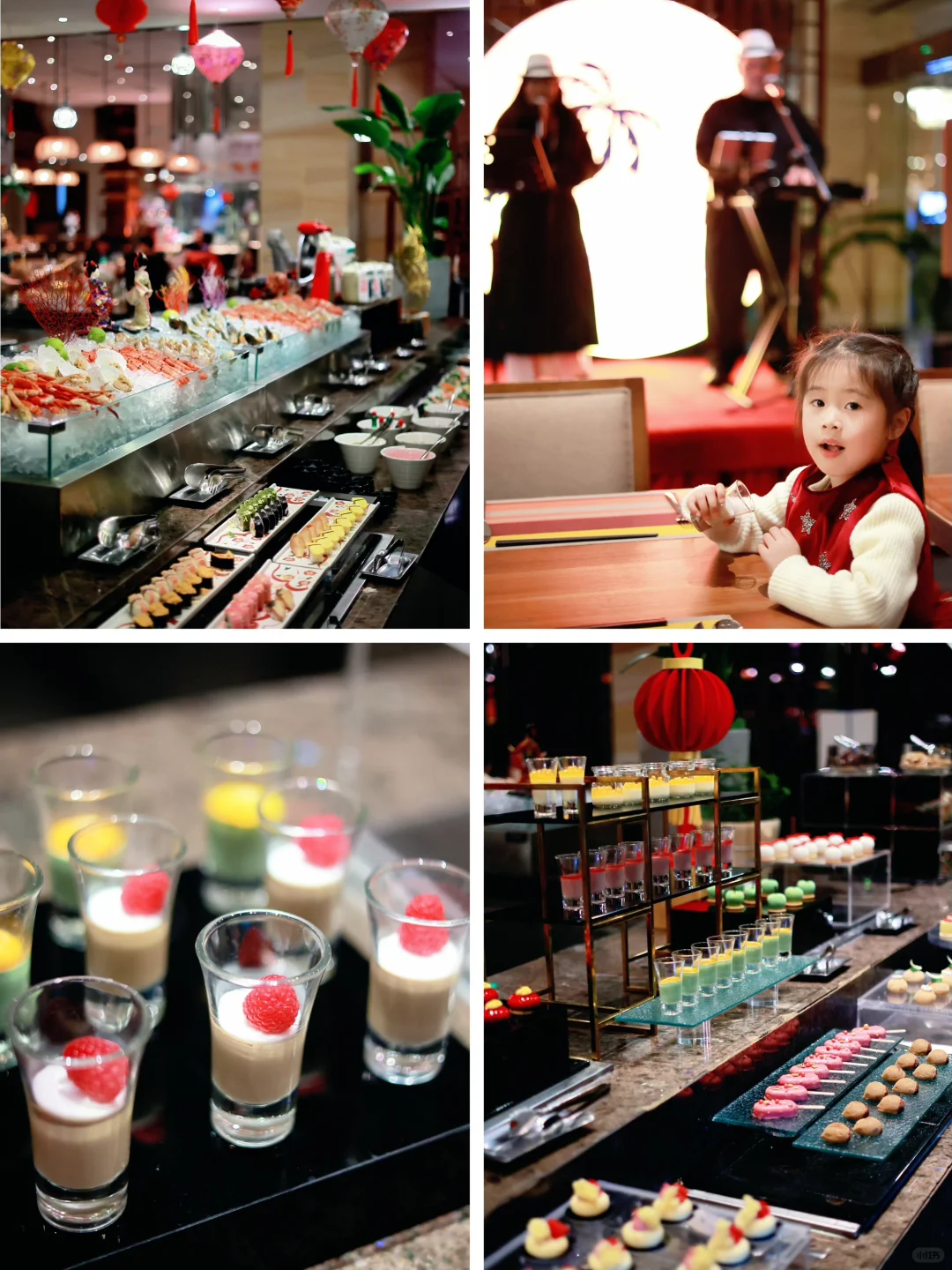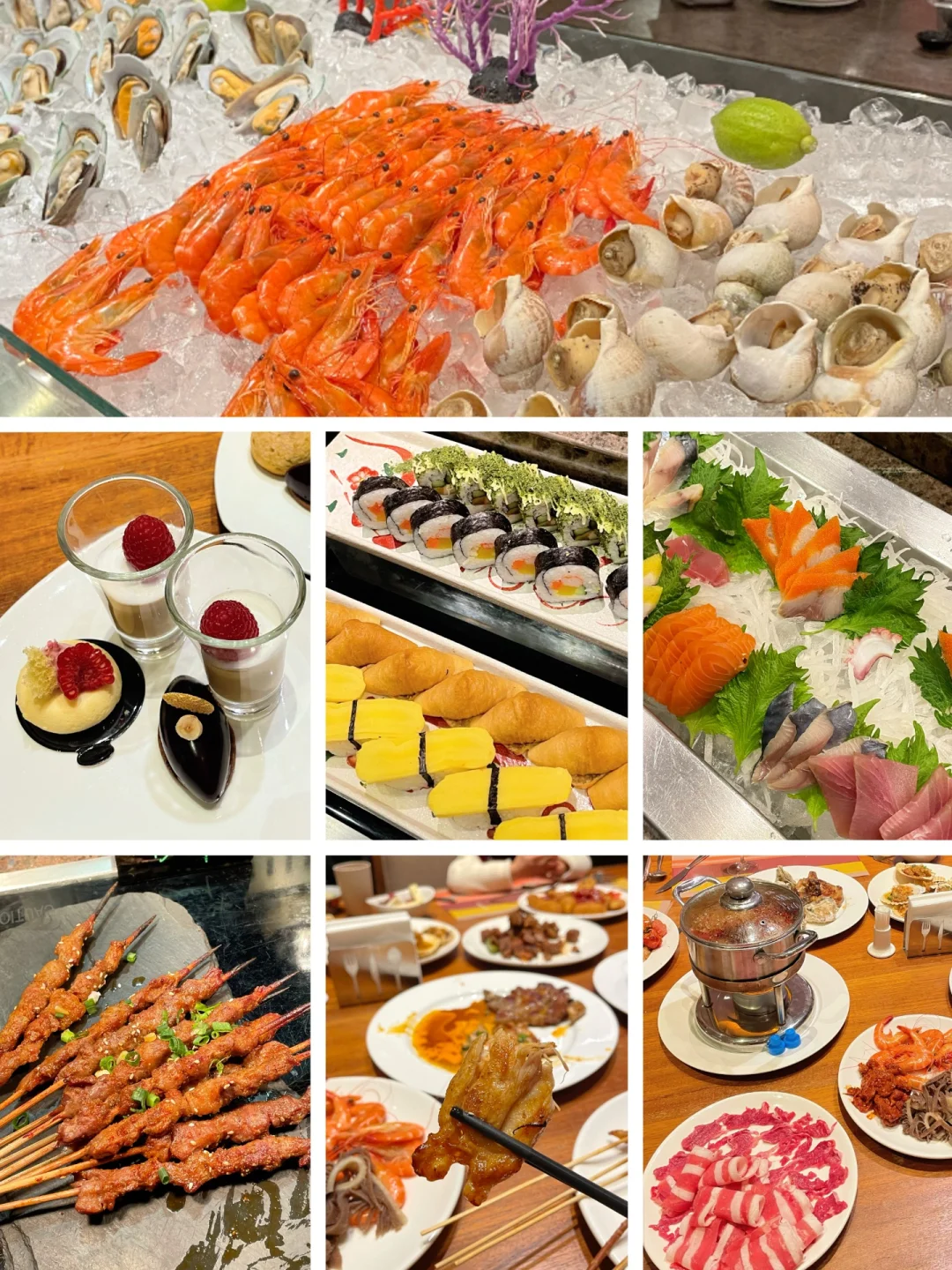 周五晚上我们吃的自助晚餐,以火锅🍲烧烤为主,还有海鲜🦞、菜品种类很丰富,饮品、甜品、水果应有尽有……餐厅🍴还有驻唱歌手,一家人👨👩👧👧吃着美食、听着🎵氛围感拉满~