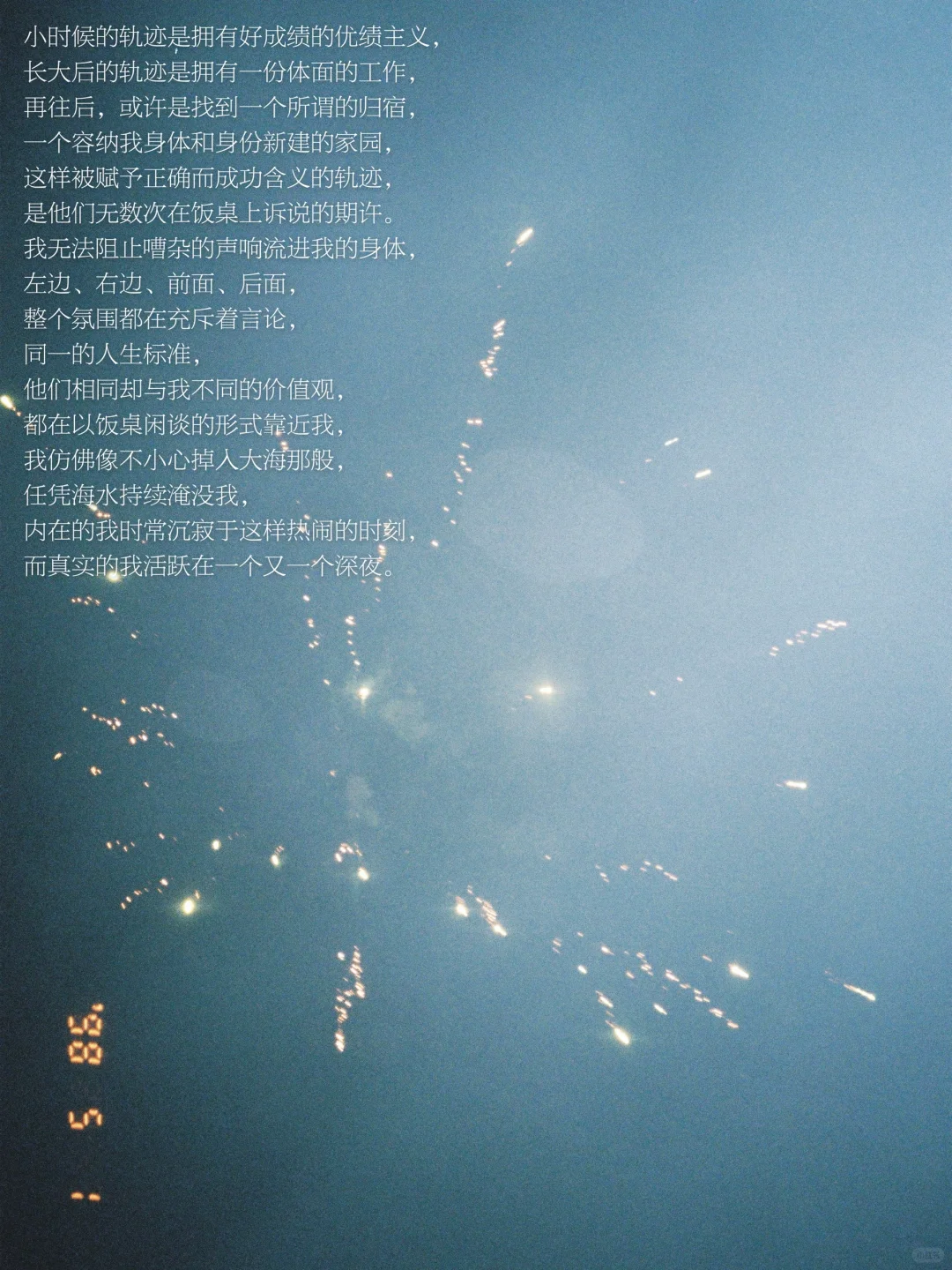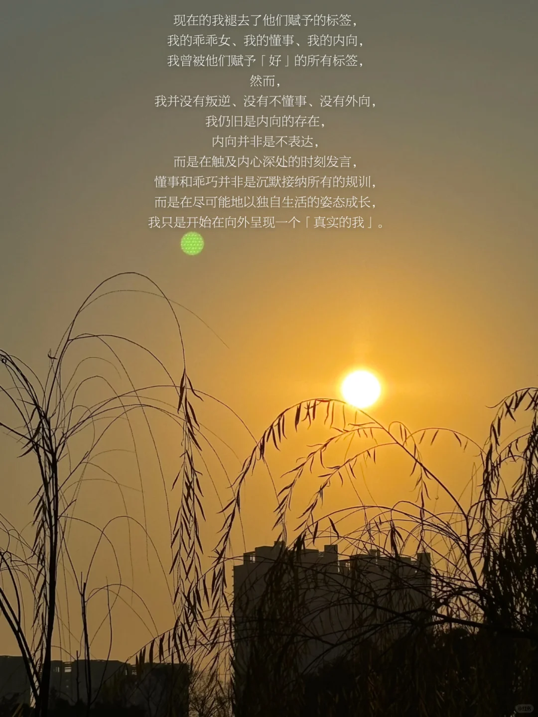 现在的我褪去了他们赋予的标签,开始在向外呈现一个「真实的我」。我没有拥有他们可以在饭桌赞扬的成功人生,我没有再因没有拥有世俗的成功而感到恐惧,我没有再比较与我同龄或同阶段生命的人生,我没有再被那些嘈杂的声响流入身体而改变轨迹,我只是平静地回答关于一部份的我,而不是去长篇大论关于我的生活。