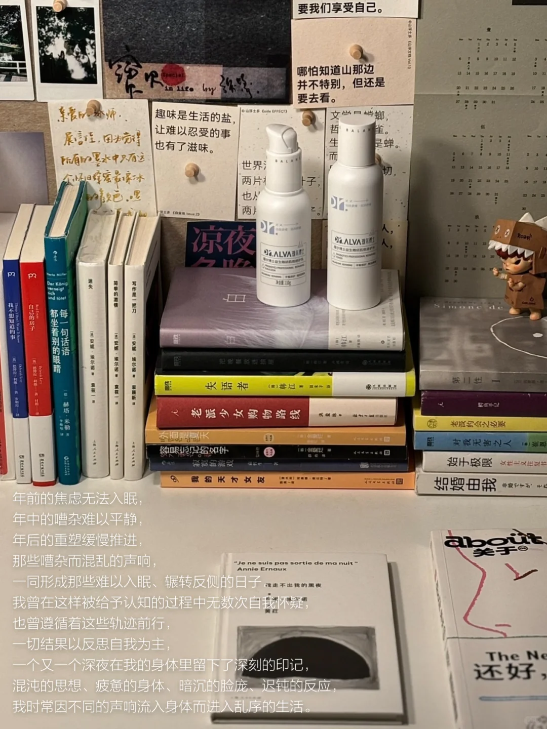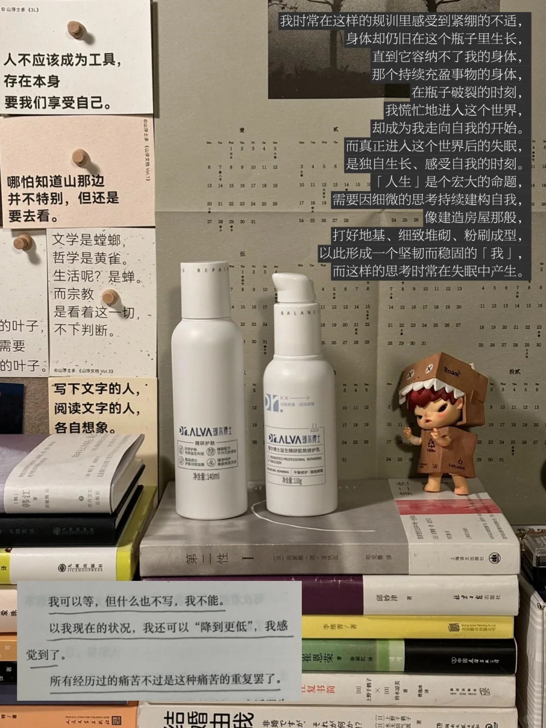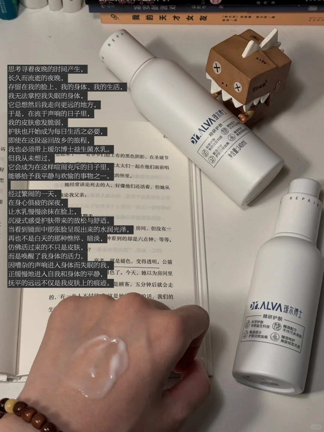 思考寻着夜晚的时间产生,长久而流逝的夜晚,存留在我的脸上、我的身体、我的生活,我无法掌控我失眠的身体,它总想然后我走向更远的地方,于是,在流于声响的日子里,我的皮肤愈发脆弱,护肤也开始成为每日生活之必要,即使在这段返回故乡的旅程,我也必须带上瑷尔博士益生菌水乳。但我从未想过,它会成为在这样喧闹充斥的日子里,能够给予我平静与欢愉的事物之一。