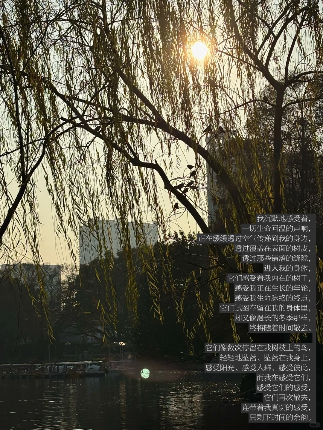 我沉默地感受着,一切生命回温的声响,正在缓缓透过空气传递到我的身边,透过覆盖在表面的树皮,透过那些错落的缝隙,进入我的身体。它们感受着我内在的树干,感受我正在生长的年轮,感受我生命脉络的终点,它们试图存留在我的身体里,却又像漫长的冬季那样,终将随着时间散去。