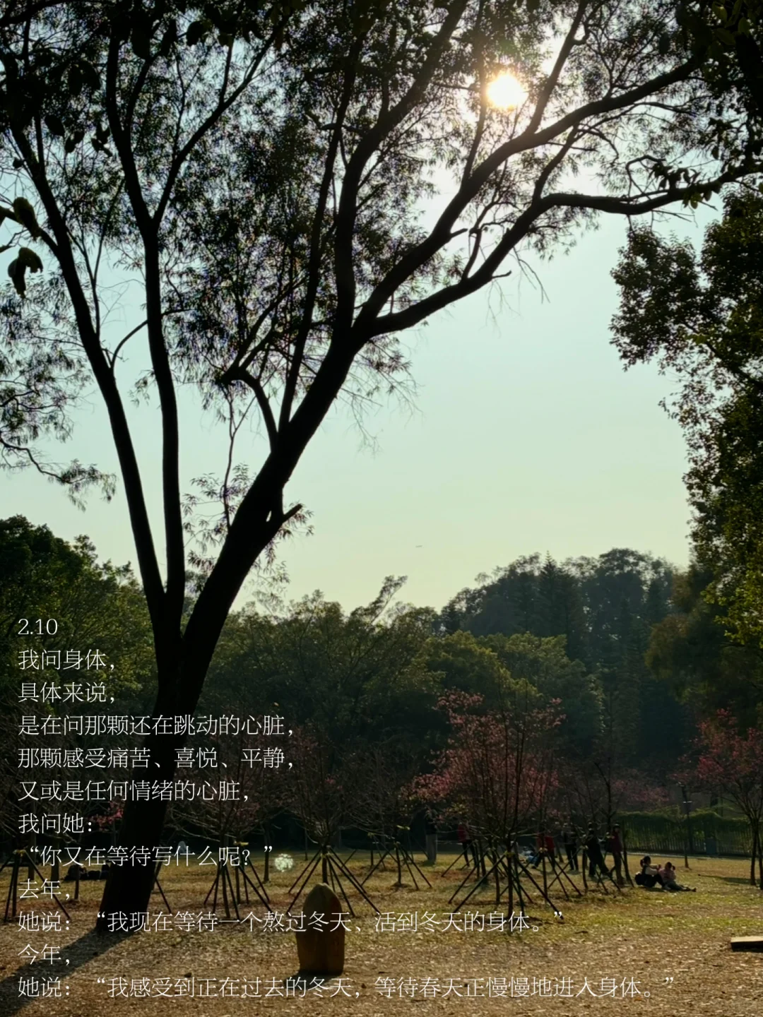 那颗感受痛苦、喜悦、平静,又或是任何情绪的心脏。我问她:“你又在等待写什么呢?”去年,她说:“我现在等待一个熬过冬天、活到冬天的身体。”今年,她说:“我感受到正在过去的冬天,等待春天正慢慢地进入身体。”