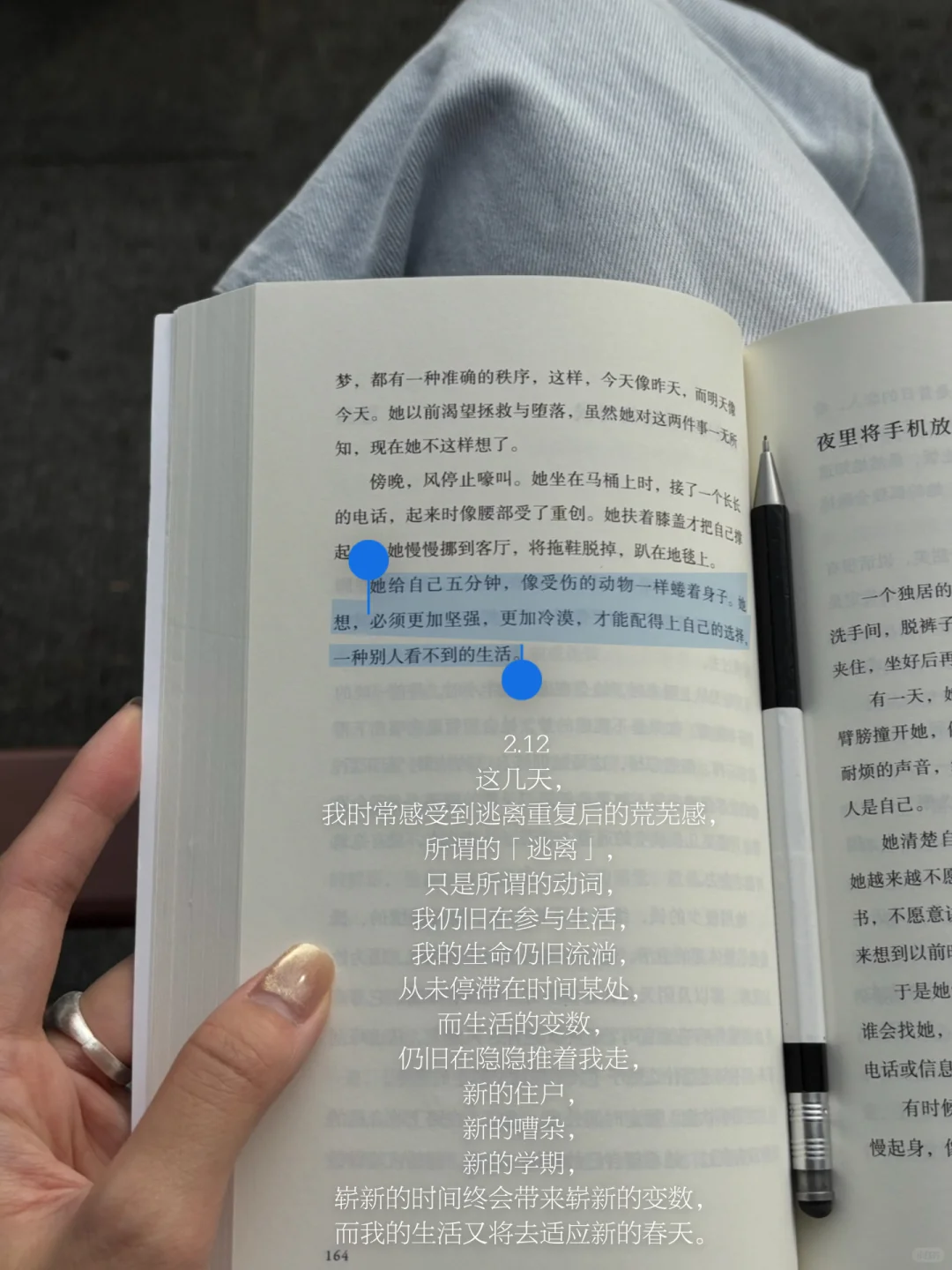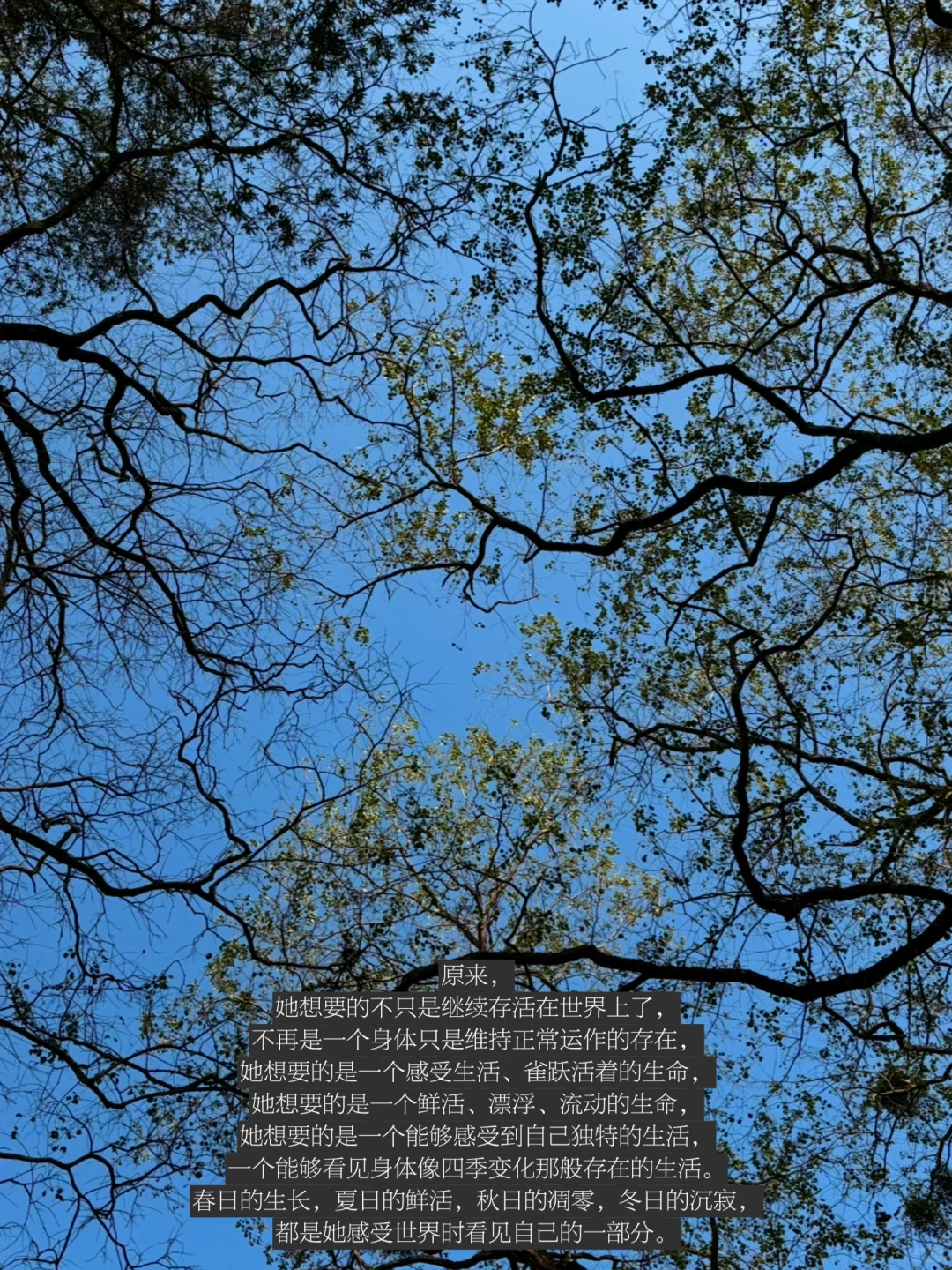 原来,她想要的不只是继续存活在世界上了,不再是一个身体只是维持正常运作的存在。她想要的是一个感受生活、雀跃活着的生命;她想要的是一个鲜活、漂浮、流动的生命;她想要的是一个能够感受到自己独特的生活,一个能够看见身体像四季变化那般存在的生活。春日的生长,夏日的鲜活,秋日的凋零,冬日的沉寂,都是她感受世界时看见自己的一部分。