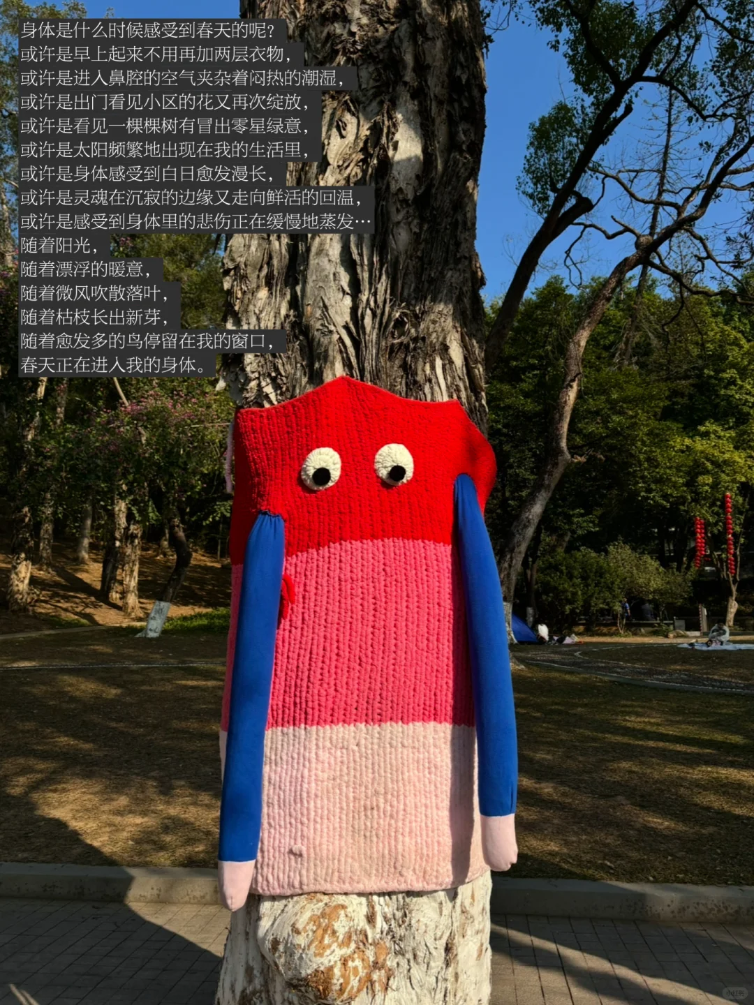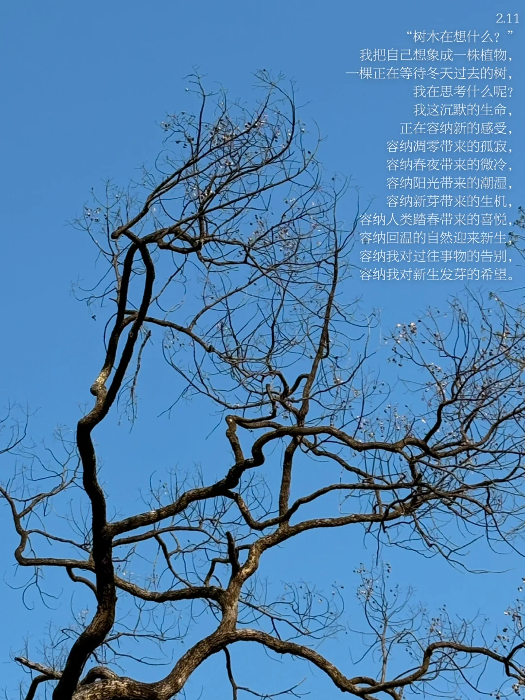 “树木在想什么?”我把自己想象成一株植物,一棵正在等待冬天过去的树,我在思考什么呢?我这沉默的生命,正在容纳新的感受,容纳凋零带来的孤寂,容纳春夜带来的微冷,容纳阳光带来的潮湿,容纳新芽带来的生机,容纳人类踏春带来的喜悦,容纳回温的自然迎来新生,容纳我对过往事物的告别,容纳我对新生发芽的希望。