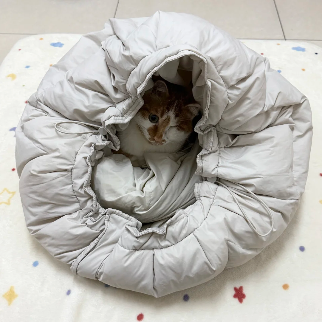 如果羽绒服的里边带有抽绳,那就更简单了,可以将抽绳抽紧一点,然后简单的整理一下,就变成了一个蒙古包猫窝。