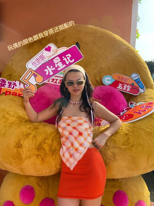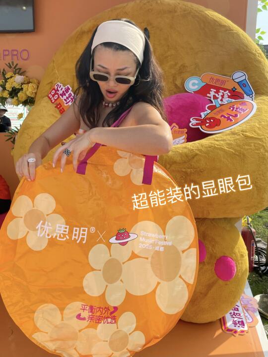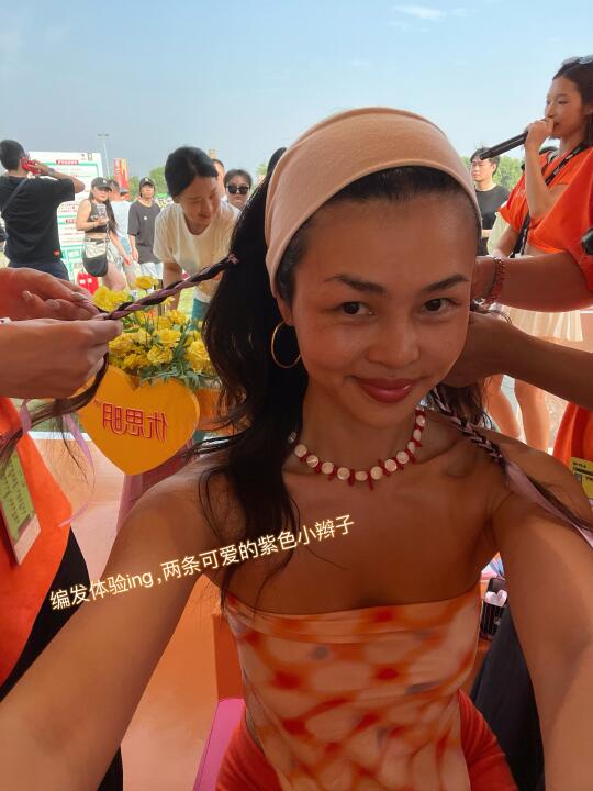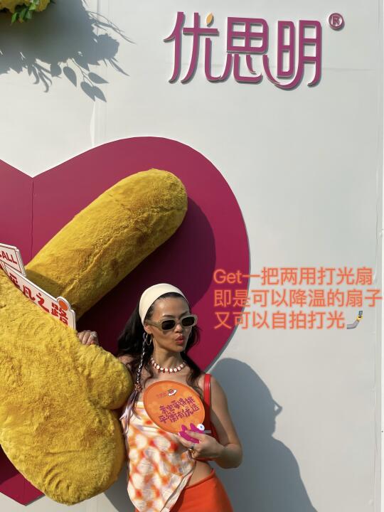 音乐节当天真的超级晒,感觉都快要中暑了!但是机智如我,等待歌手上场的时候发现优思明的展台可以玩小游戏拿奖品,简直就是我的菜为了凑齐奖品我玩了三把,分别得到了超级多巴胺的显眼包和打光扇,还体验了编发。我真的是个游戏小天才!