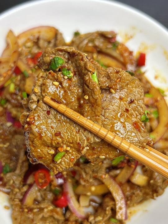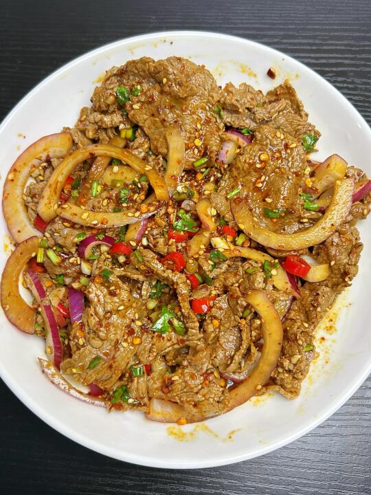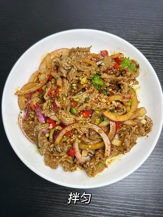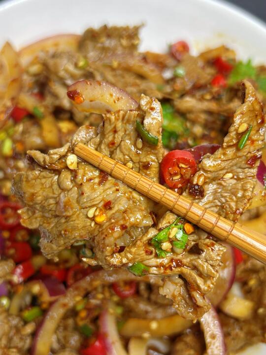 2️⃣碗里加入牛肉片、香菜、葱花、洋葱、小米辣,加入1勺生抽、1勺陈醋、1勺香油、2勺油泼辣子、熟芝麻拌匀即可