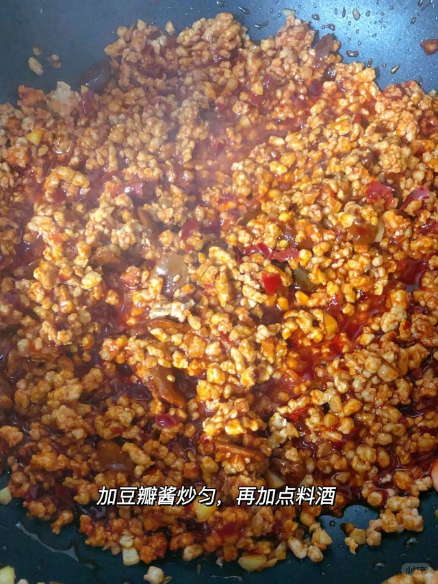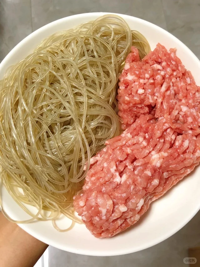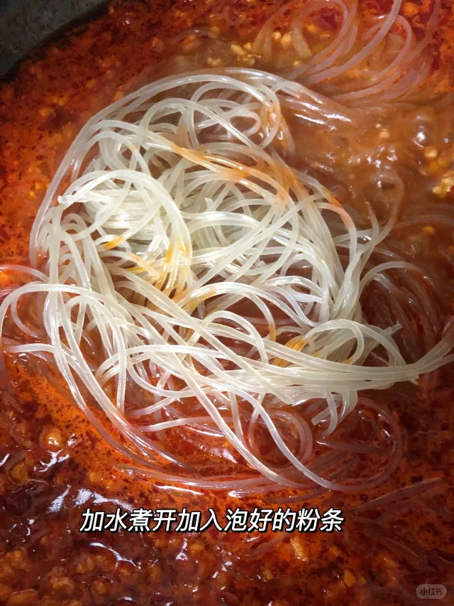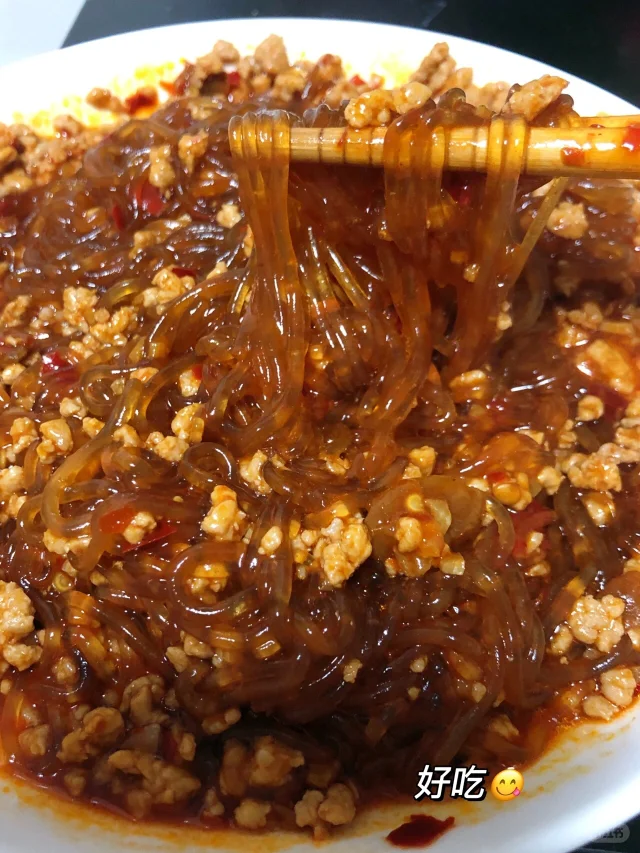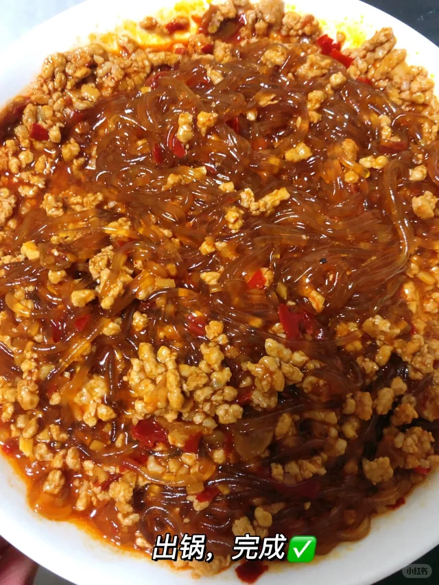 这个真的超好吃!!! 一口气吃一大盘!!! 1⃣️红薯粉条用热水提前泡一小时 2⃣️油锅炒姜末、蒜末,再加入肉末炒熟,再加豆瓣酱和料酒炒匀 3⃣️加一碗水,烧开后加入粉条,大概煮5分钟,煮熟之后就可以出锅 完成✅ 哇!! 太香啦!! 拌米饭也是很绝!!