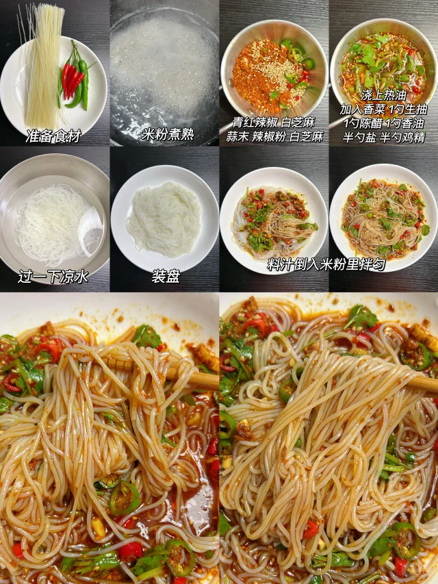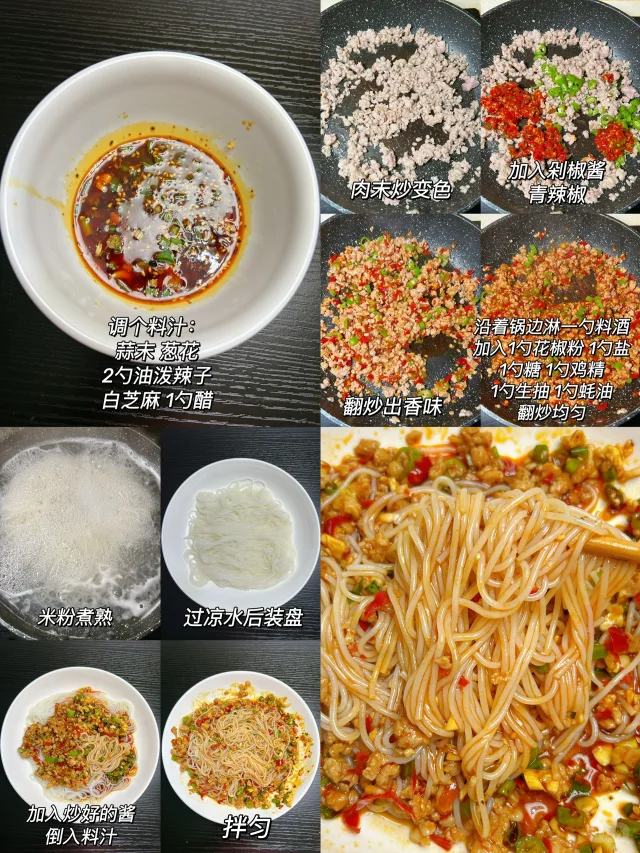 今天分享四种米粉吃法 简单又好吃!! 真的太香啦!! 1️⃣香辣拌米粉 2️⃣剁椒拌米粉 3️⃣剁椒肉末拌米粉 4️⃣鸡蛋肉末拌米粉 食材和做法都在图上啦!