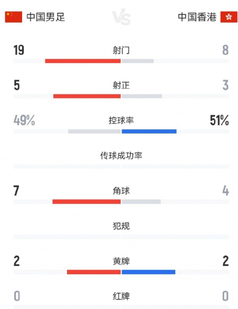 国足1比0中国香港,全场数据:射门数19-8,射正5-3,控球率49%-51%