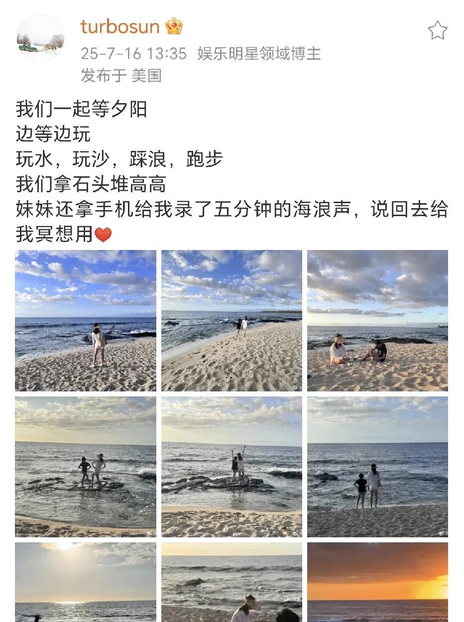 孙俪带娃出游! 7月16日,孙俪在社交平台晒出了和孩子们在海边玩的照片,发布地址坐标国外,这是带孩子出远门玩的节奏。 她和孩子们一边等夕阳一边玩,玩水,玩沙,踩浪,跑步,拿石头堆高高…真的是不亦乐乎,没看到超哥的身影,不知道是不是当的摄影师,还是没去。 妹妹好贴心,孙俪发文:“妹妹还拿手机给我录了五分钟的海浪声,说回去给我冥想用 ”… 两个孩子不仅长的好看,还很优秀,娘娘真的带的好。