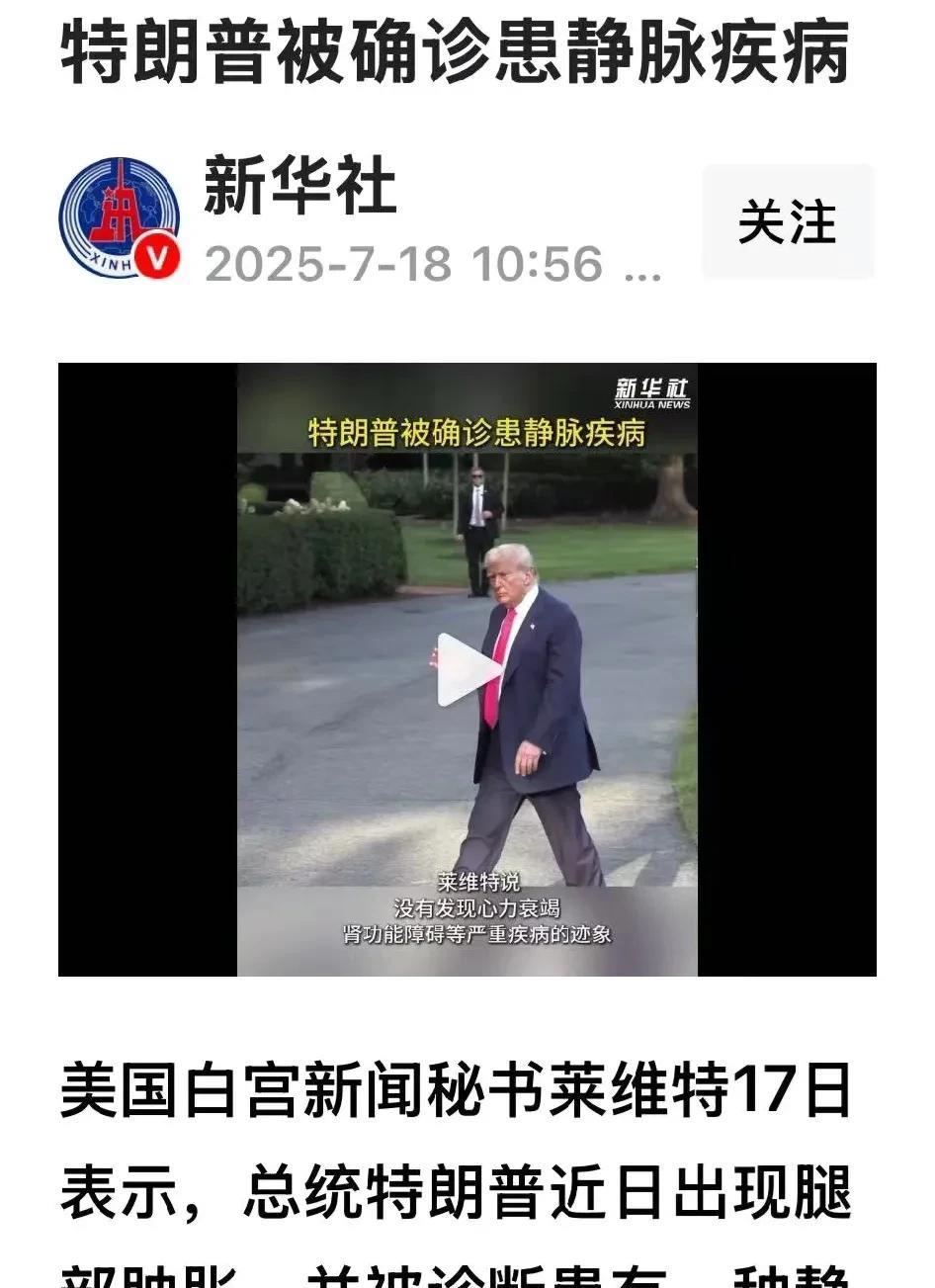 假不了,特朗普得病了! 这消息可是17号由美国白宫新闻秘书莱维特宣告的,肯定假不了!说是腿部肿得跟个大馒头似的,经检查后被确诊患上了一种静脉疾病。 这个老头子呀,腿都出问题了还那么能折腾,这就如同一辆破车子,零件都快散架了还到处乱冲乱撞呢。要是没病,还不把世界搅得像一团乱麻似的呀? 现在病了,那就安安稳稳在家养病吧,少发些推文,少生些闲气,少搞些花样,让世界清静几天吧! 地球离了谁都照转,不少特朗普一个!唯一可能的是会少一些笑料! 不过有万斯和印度三哥在,这世界不会沉寂! 毕竟万斯的爹还得找,眼线笔还得卖! 三哥的飞机还会掉,牛皮还会吹!