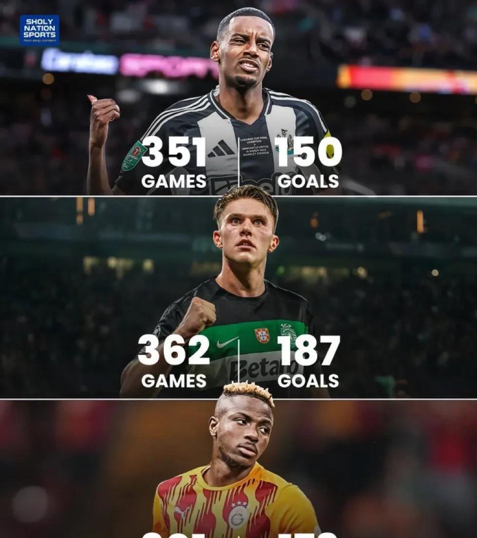 现役新三大锋霸伊萨克、哲凯赖什、奥斯梅恩数据对比,具体信息如下: 1. 伊萨克:351场比赛,150个进球 2. 哲凯赖什:362场比赛,187个进球 3. 奥斯梅恩:301场比赛,173个进球 你觉得谁的能力更强?#哲凯赖什# #奥斯梅恩# #凯哲赖什# #伊萨克哈贾尔# #布赖恩·哈兰德# #挪威足坛名将# #迪米特勒夫# #伊萨克·博阿滕#
